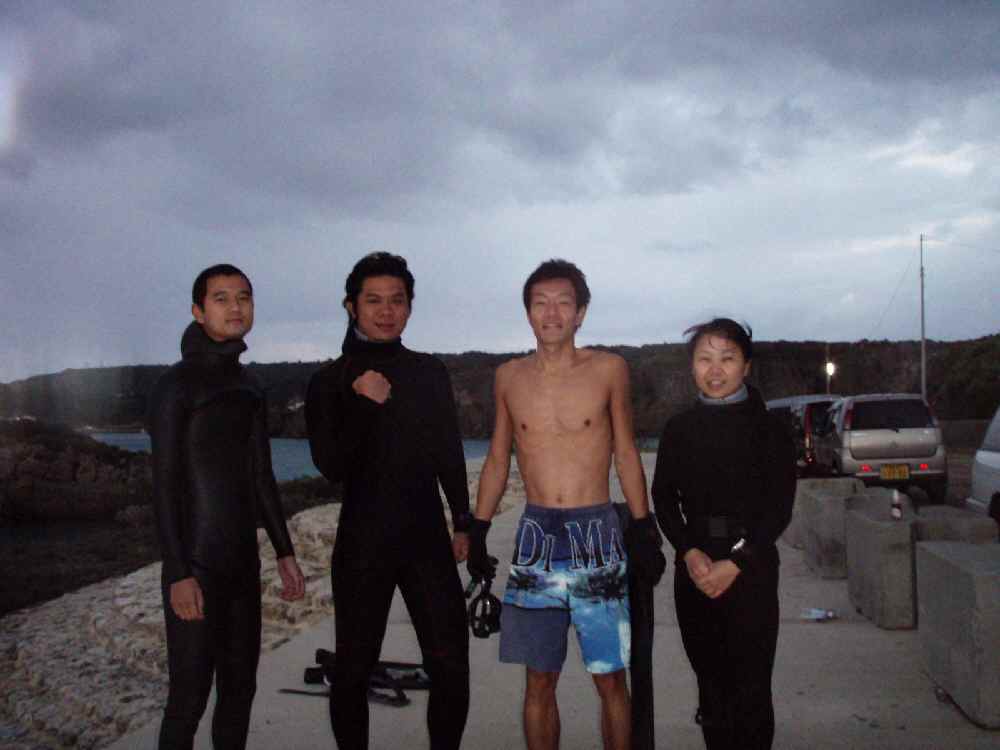元旦。今年も潜り初めへ行った。なぜ誰も「中止にしましょう」と言い出さなかったのか?理解に苦しむところ。猛烈な北風が吹きすさぶ中、海中道路のあやはしロードパークに集合し、伊計島へ渡る。去年と同じポイントだったのでただ潜るだけじゃつまらんと思い、よせばいいのにウェットスーツを着ずに海パン一丁で潜りました。ちなみに気温13℃、水温17℃。あまりの寒さに錯乱状態となった。が、曇りの予報もなんのその、東の空は雲が切れて綺麗な日の出を拝むことが出来ました(水平線から、ではなかったけど)。朝日をバックに海面に浮かぶみんなのシルエットが最高!これにはちょっと感動したね。