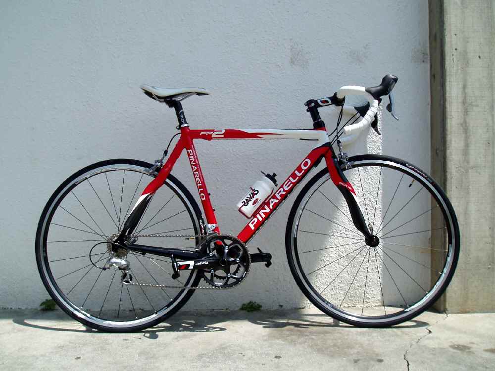 PINARELLO FP2、同価格帯の他車種といろいろ迷ったが、コレにして正解。一発で気に入った。特にピナレロの代名詞と言われているグニャっと曲がったONDAカーボンフォークがいい。その形状にどんな効果があるかって?そんなの俺の知ったこっちゃない。とにかく見た目がカッコイイ。それだけで十分。