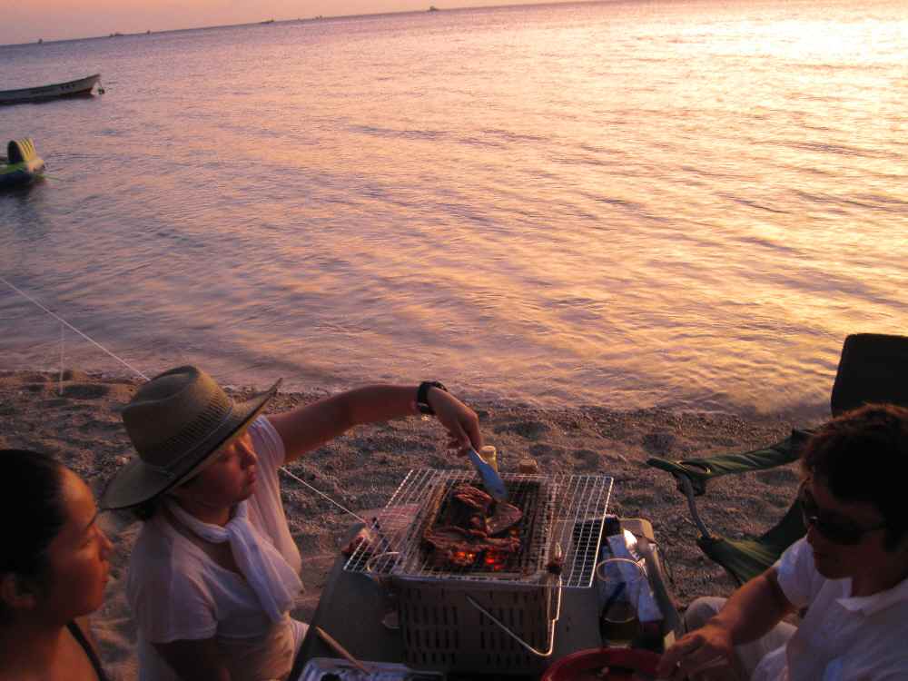 7/16(土)からの海の日三連休は、FLUKE-UPの伊是名島キャンプ!の予定だったが台風接近によりフェリー欠航が濃厚だったので、備瀬崎のビーチにて海洋博花火見学キャンプへ急遽変更。もちろん素潜りもしたけど、期待していた北側のビーチは既に台風の影響が出ており、大荒れ。むしろインリーフでやった「見釣り」が熱かった。糸だけの仕掛けを持って素潜りしながら魚を釣るわけですが・・・ザコい方々はアッサリ引っ掛かってくれます。足がつくほどの浅瀬だが、上潮の時間帯でリーフ内にもガーラ等の大物が入ってきており、一人興奮気味の俺。で、タマンの群れがいたので離れたところから浮を流して狙っていたところ、KYなムラサメモンガラが遠くから一直線に餌に向かってきて食いついて、針ごと持っていってくださいました。結局、釣れたのはトラギス2匹とベラ1匹。もちろんBBQの食材となりました。日が暮れると、いよいよ本命の花火大会。人ごみに巻き込まれることもなく、ゆったりと見学できた。帰りの車の心配もなくビール飲めるし、大渋滞にも巻き込まれず。これは良い!