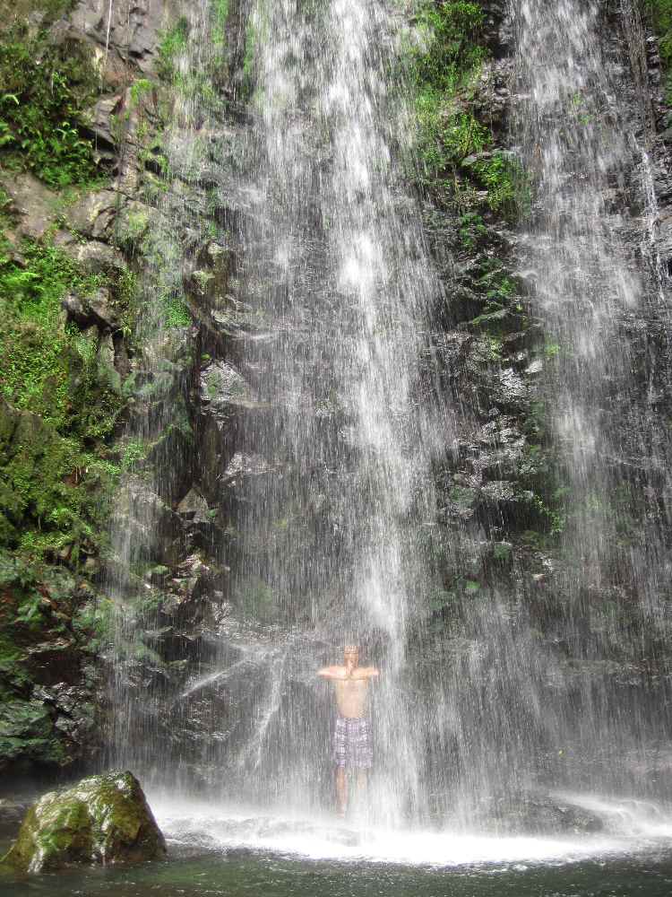 翌日はさっさとテントを撤収し、ター滝へ。。。約1名、前日負傷していたので他3名にて川を遡る。前日風呂にも入ってなく身体ベトベトだったので、着替えの服が若干足りないにも関わらず、3名全員滝壷に飛び込まずにはいられなかった。ついでに、滝に打たれて修行もしてみました。で、帰りは「最後くらい少しだけセレブチックに」とブセナのランチバイキングに寄って終了。僅か一泊だったが、十分。他の参加者には申し訳ないが、どうせ俺は10月にも毎年伊是名行くし、むしろ台風のお陰で行き先変更になって良かった。