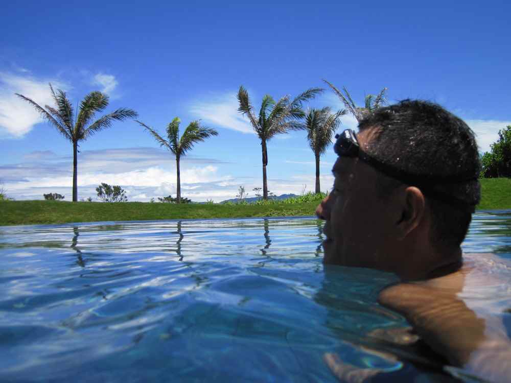 れっきとした「リゾートホテル」なので、到着したときには既に夕方だったがビーチで泳ぐ。ド干潮時刻のハブクラゲネット内ということで一番沖でも水深1m以浅であり、魚はというと呆れるほど頭の悪いフグが5〜6匹群れている程度だったが、水浴びできるだけでもOK。妻は久々の海でさぞ気持ち良かったはず。で、そのまま屋外プールへ。こちらも良い具合に水が温まっていて、長居しました。夜は当然、星を見る。当然、道路に寝転んで見る。