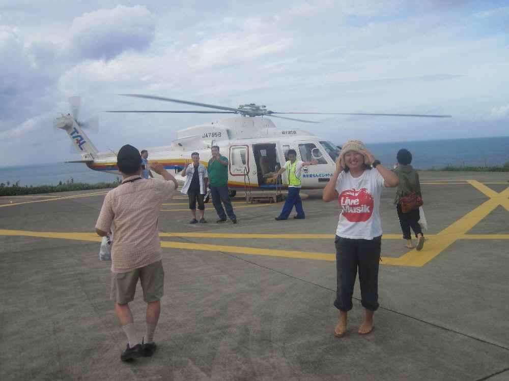 二郎丸で一緒だったカオリさんとユミさんは今日の船で帰る予定だったが、前述の通りフェリー欠航。で、ヘリで八丈島移動するため、ヘリポートへお見送りへ。三宅島もそうでしたが、ヘリの到着・出発のときはセキュリティのため、島の駐在さんがターミナル小屋へ必ず来ます。少しでも不信な挙動をとると吹き矢で撃たれます(ウソ)。飛び立つ瞬間は風で帽子が飛ばされそうになりました。