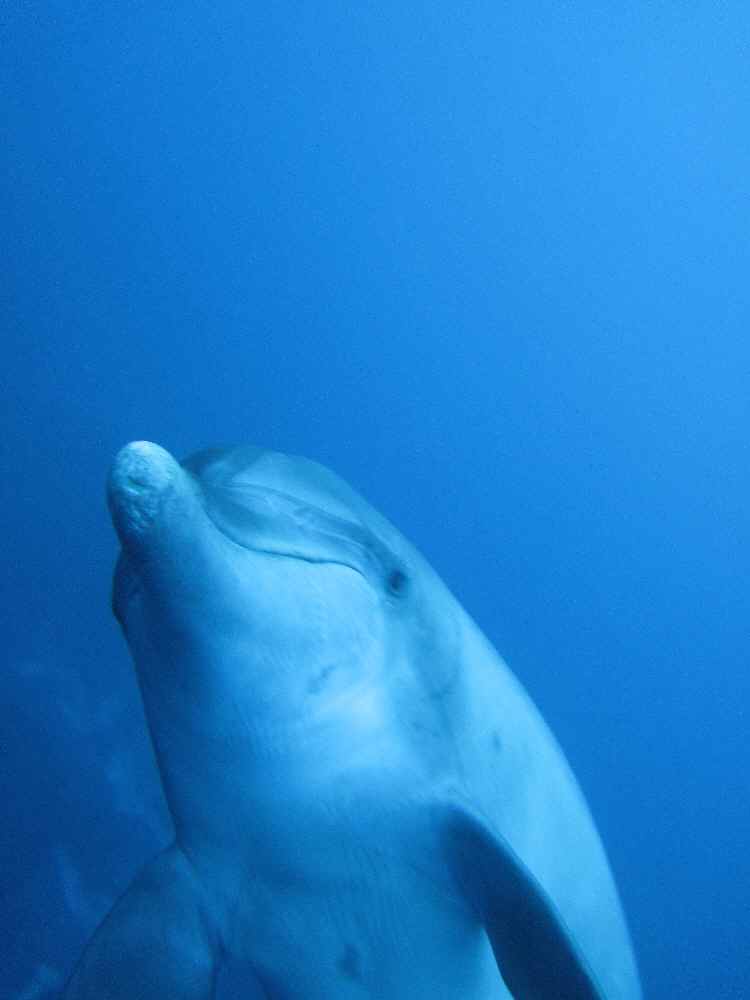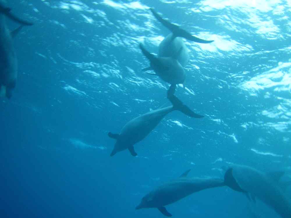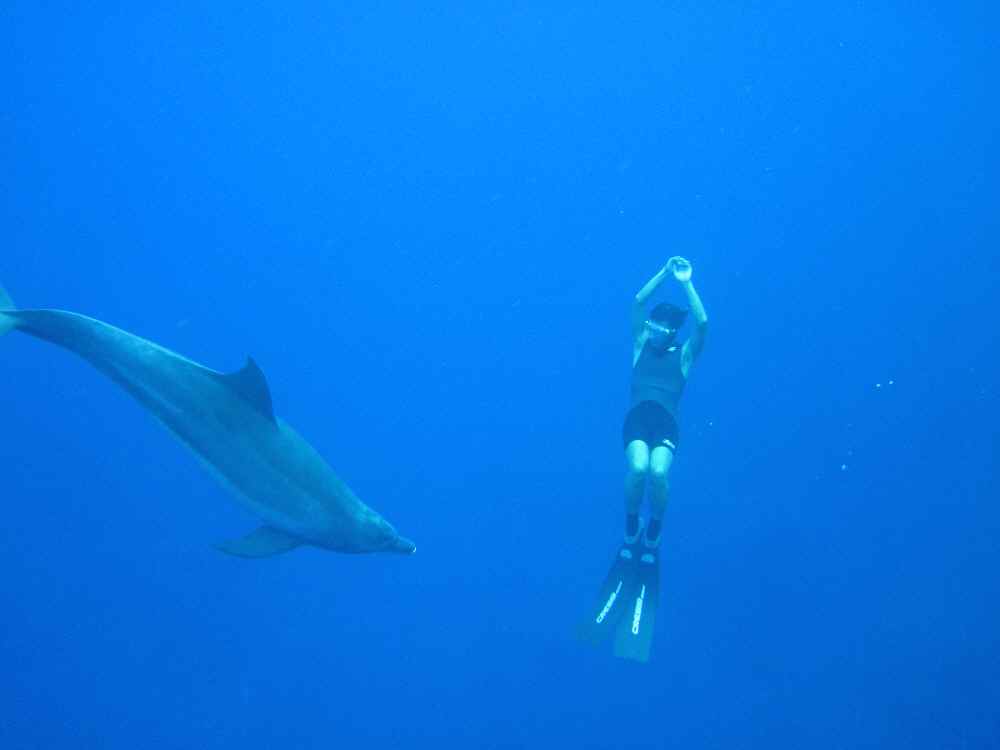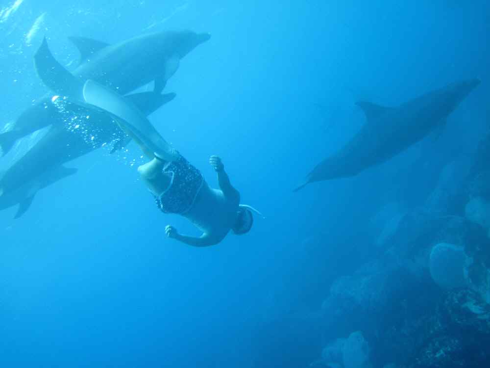 最初に遭遇した群れは凄かった。全員がめちゃくちゃ遊びたがっており、エントリーした瞬間、四方八方からイルカたちが向かってきて、どいつを見ればよいかわからないくらいだった。とりあえず、群れに紛れ込んでドルフィンキックで泳ぎまくる。