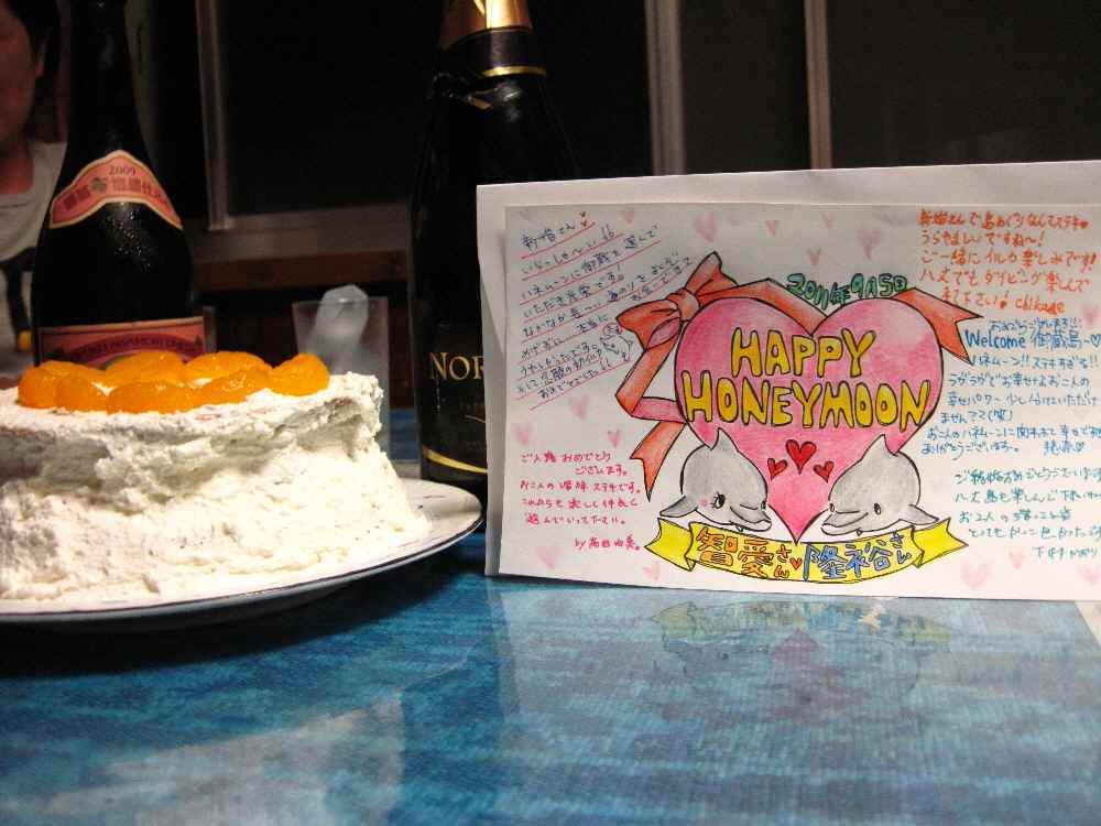 で、食後にデザートが・・・って言って音楽とともに登場したのは、なんとウェディングケーキ。そうです、俺たちが「新婚旅行」だったので、わざわざ手作りで用意してくれてあったのです!そしてメッセージカードも。スタッフお二人だけでなく、お客の3名もメッセージを添えてくれてあった。しかも秘密裏のうちに・・・ドルフィンから戻って山行って・・・一体いつのまに??