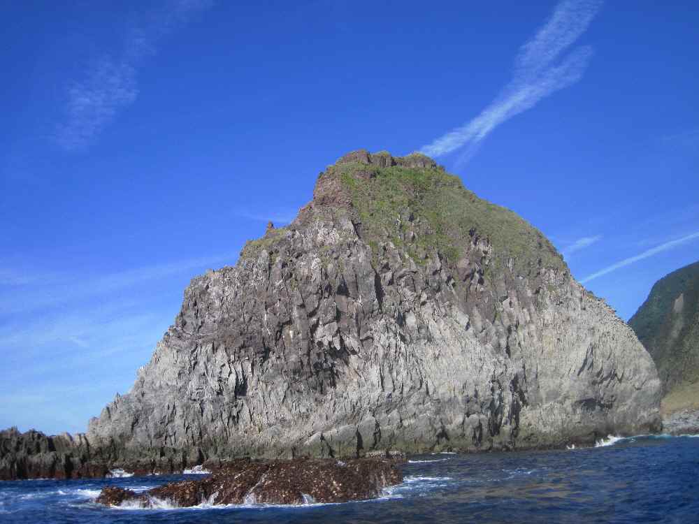 港を出てもイルカの群れがなかなか見つからず、島を半周ほど進む。島のちょうど反対側にある大きな岩「本根」の手前まで来て折り返す。この根の周辺は今日は波が荒くて近づけないとのこと。戻りながらみんなで群れを探す。しかし・・・見上げてみるととんでもない島やな、御蔵島。断崖絶壁オンリーやん。「秘境」と言っても言い過ぎではない。