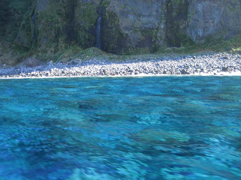 港へ戻る道すがら、海の色がエメラルドの宝石のように輝いている。こいつはスゴイ。