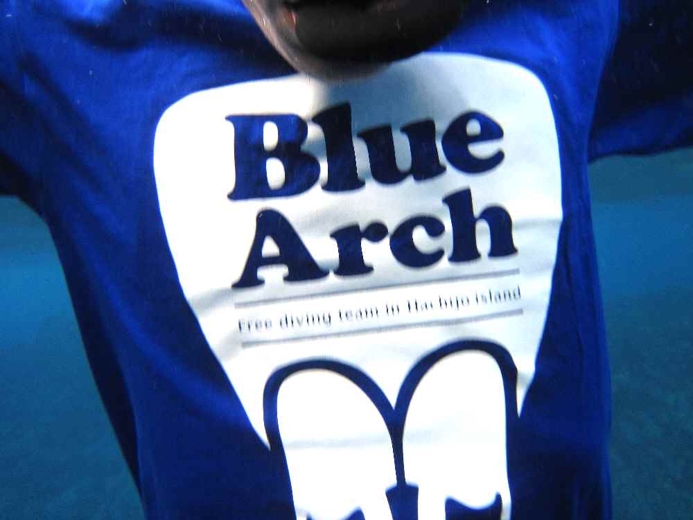 アーチのポイントまで行ってみると、多くのスクーバダイバーに混じって、一人だけ素潜ってる女性が。ピンポイントでココへ来てるってことは、Blue Archの二人の知り合いでしょうか。俺はノーフィンでアーチくぐりに挑戦したが、海面で息整えてるうちに流されてしまってて断念。