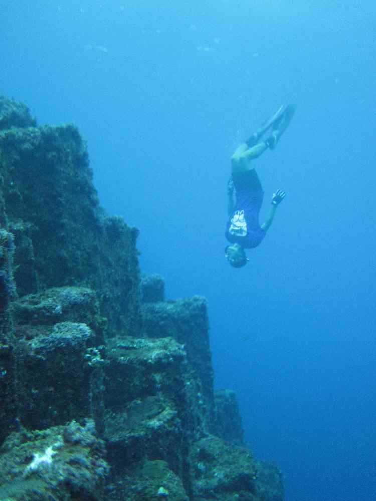 で、目的のポイントに到着。六角柱のカタチをした岩が上に向かっていくつも突き出ているようなカタチをしている。これも火山活動によって自然にできた地形とのこと。この周辺で潜って遊ぶ。アーンド、Blue Archのお二人は相変わらず撮影。この日は俺とお蝶はBlue Arch Tシャツを着て海に入っていたので、いろいろリクエストに応じたり、逆に俺がカメラ持って2人を撮影したり。こんな素晴らしいポイントに来られたのも、お二人に出会えたからこそ。