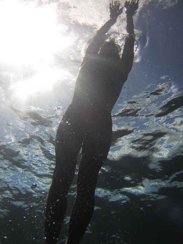 島の東側に戻ってきた。小さい群れに何度か遭遇。少し島から離れた水深20m程度のポイント、海底はうっすらとしか見えない。イルカがかすかに下に見えているときは、頑張って潜るしかありません。それでも、沖に去って行ってしまいました。終了かな。