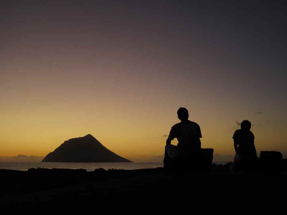 さて、ヒサヨさんが車で迎えに来てくれたのだが、BBQの準備がまだ完了してないとのことで、ヒサヨさんオススメの夕日スポットへ連れてってくれました。島の北西部、八丈小島を望むポイント。溶岩が固まってできた岩場・南原千畳敷きといわれる地形も有名。