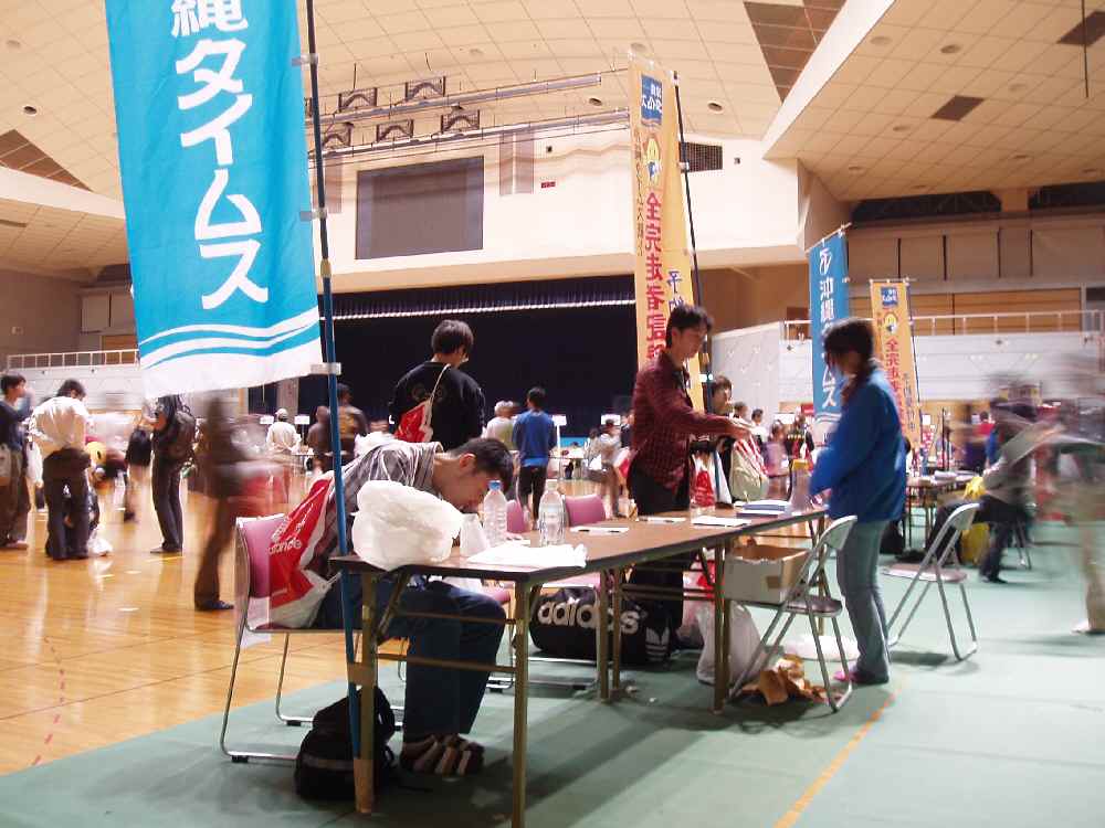 <写真1>大会前日の受付に滑り込み!奥武山公園武道館にて。