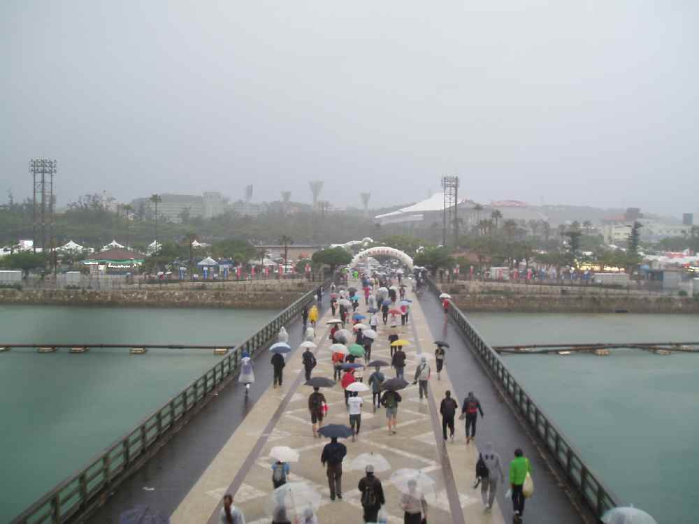 今年こそフルのベスト更新、願わくばサブ3.5を達成したい、沖縄マラソンのリベンジ、と意気込んでたのに、10月中旬から仕事が炎上ぎみ、それに合わせるように体調崩し、咳が止まらずに夜も眠れない状態。最悪なんてもんじゃない状態。しかも1週間とかで回復せず、11月末まで引っ張った。当然、ほとんど走れてない状態。あぁ。。。 荷物置き場は予想以上に泥んこ。しかもみんなギリギリまでテント内で待っているもんだからすごい人だかり。とはいえすぐに8:10の整列時間が近づいたので、トイレすませて整列。ゴミ袋製使い捨てカッパを着て整列位置に並ぶも、すぐに身体が冷えてきてしまう。フード付きのカッパじゃないので襟のところから水が入ってきて結局ウェアもズブ濡れだし。寒がりな俺だけでなく、周囲の人もけっこうガタガタしてた。今回ばかりは着ぐるみの選手を心底羨ましく思った。 待ちに待たされたがようやくスタート。Cブロック最前列のあたりからだったが、ロスは30秒程度で済んだ。走り始めれば寒さなんて忘れてしまうもので、周囲の選手には早々とカッパを捨てる人も多かったが、俺は終盤まで(最後まで?)着ていく予定。寒い中で1時間近く待たされたので既に尿意をもよおしており、与儀公園のとこでトイレ寄ろうかと思ったが、行列できてたのでパス。最初の5km地点のAid手前で早くもショッツ1本使用。朝飯軽めだったのと、冷えた身体を早く温めたかったため。寒くなくても、ここらで1本使っておくのは良いかも。 今大会から一部コースが変更になっていた。5kmのAidの先、昨年までは古波蔵のとこで右折していたが今年からは直進、次の真玉橋のとこで右折してバイパスへ入る。こんな雨の中だってのに、ヤグラに上って太鼓叩いて応援してくれているおじーの姿が。頭が上がりませんな。7km過ぎ、いつも通りここでトイレ(小)へ寄る。30秒程度ロス。 バイパスから右折してR517へ。スポンジは全く、給水もほとんど摂らずに進む。高速道路の下で左折、ここもコース変更箇所。旧コースではここから小さなup/downがあったが、今年からは緩やかな上りが長々と続くコースに。ただこのあたりが10km付近で、身体的に一旦ラクになってくる距離なので、緩やかな上りであれば負担にはならない。しばらく進んで、東風平のジャスコのとこでいつものコースへ合流。ちなみに「上りで抜く、下りで抜き返される」はBIKEだけでなくRUNでも同じな俺。BIKEでは、体重が軽い・ホイールがショボイ・ビビリな性格etc.で説明がつくかもしれないが、RUNではそうはいかない。下りの走り方がヘボいとしか言えない。これもちゃんと下りのフォームを身に付けないと。 ここから先は同じような景色が続き、up/downもあって意外に長く感じるので、地面と時計のラップタイムだけを見ていく。常に5分を少し切るラップで来ているので目標通り、イイ感じである。トータルでも最初の5kmでのオーバー分をほぼ回収。このままのペースを維持さえすれば「30分切り」はいける。具志頭T字路を左折、ここから少し上りが続く前半の正念場。若干キツさを感じてくる頃(結果的に、ここでキツさを少しでも感じているようだと最後まで持たない)。長い坂道を上り切ると20km地点、ここから下り。中間地点で1'45''14、目標ペースにほぼピッタリ、後半勝負だ。 平和記念公園内のAidを過ぎると少しラクになった気がしてペースが上がる。大度の下り坂、おっと前方にGALEジャージが。平田会長でした。第1回大会から全27回完走者の証・ブルーのゼッケンです。すごいことです。声を掛けて少し会話。まともに会ったのは2年前の1回しかないのでたぶん「誰?」って思われていたはずだが、同じジャージってことで気づいてもらえた(と思う)。 この辺りから、開けた場所では北風がビューっと吹き付ける。ゴミ袋カッパがバタバタするのでジャマだが、脱ぎ捨てたら寒そう。やっぱ着たままで正解だった。 米須から先、南部病院前まで、緩やかだがup/downがある。ラップが5分を超えることが多くなってくる。まだトータルタイムでは目標を切ってるので、平坦区間まで辛抱すればまだ可能性はある。最後のショッツも使用。一旦逸れた国道へ再度合流。この少し先も道路が新しくなったことで少しだけコース変更。ここから40km手前までの約10kmは完全に平坦、ここから上げて行かなければ・・・が、かなりしんどくなってきた。前の選手たちについていくのがやっと。脚の痛みでキツいのではなく、純粋に苦しい状態。やはり直前の走り込み不足は覿面に現れた。俺は左脚に力みが入りやすいため、右脚に軸を置くイメージで走ると結果的にバランスが良くなっている。右脚は効き足なので普段走ってても全くつかれないし。しかし30km超えてさすがに右脚も疲労が見えてきた。脹脛から太腿の裏側が攣りそうな兆候。慌てて塩と水分を補給する。ゴールまで着続けようと思っていたゴミ袋カッパだったが、肩の部分がついに裂けたので脱ぎ捨て