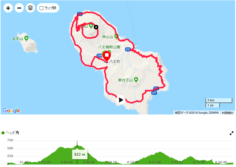 GARMINデータの抜粋。やはりアップダウンの多さが目を引くコースである。最高標高は八丈富士の鉢巻道路途中の622m。獲得標高は1700m以上である。