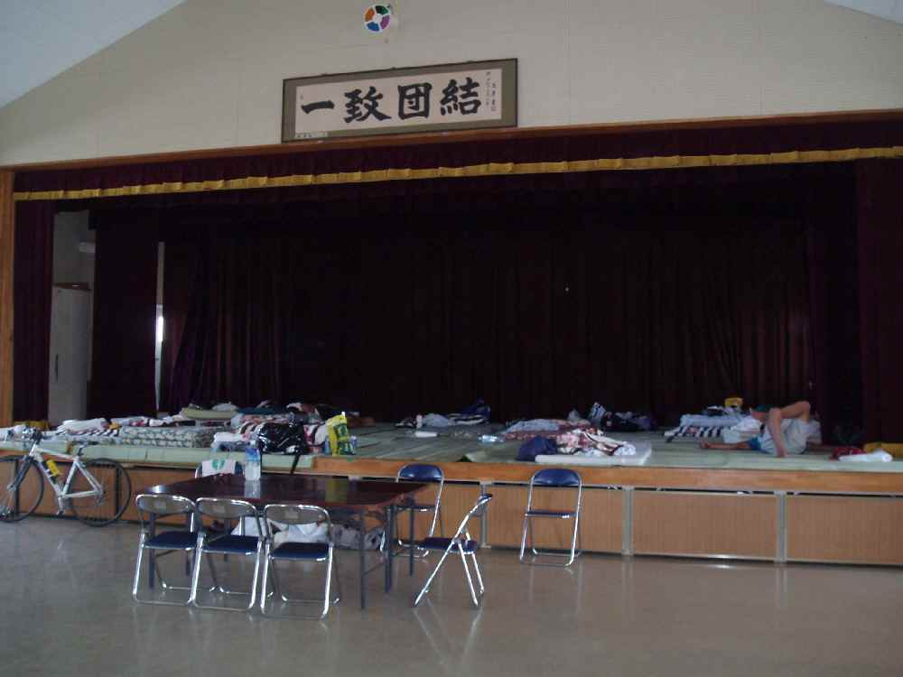 <写真1>今回は宿取れず、諸見地区体育館で雑魚寝。