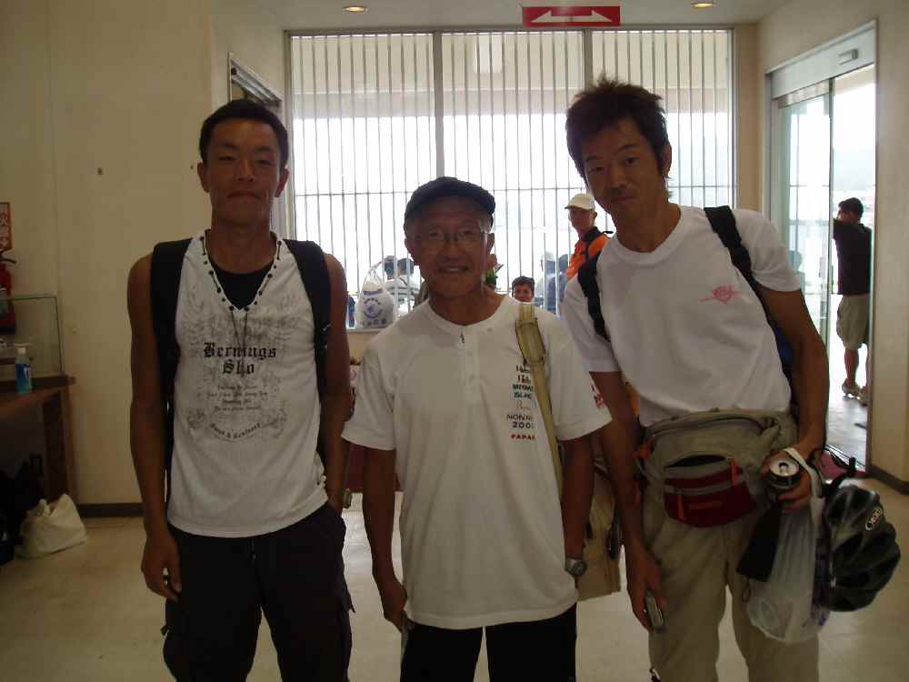 <写真>ターミナルにて。向って左から、俺・高山選手・IWAI氏。40年後、俺は伊是名を走っているだろうか?