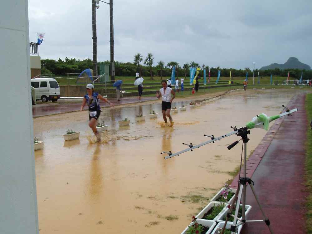 トラックの一番外側が比較的水溜まりがなかったので最初は外寄りを走っていたが、それよか一番内側のコンクリートの部分を走るほうが賢いことに気づき、水溜りをジャブジャブと突っ切ってトラックのラインまで入る。でもフィニッシュゲートは真ん中走ってゴールしたいから、かまわず池に飛び込み、泥水を跳ね上げながらゴールへ。タイムなんて全く見ちゃいなかった。もらったボトルを両手で掲げて、ゲートをくぐる。