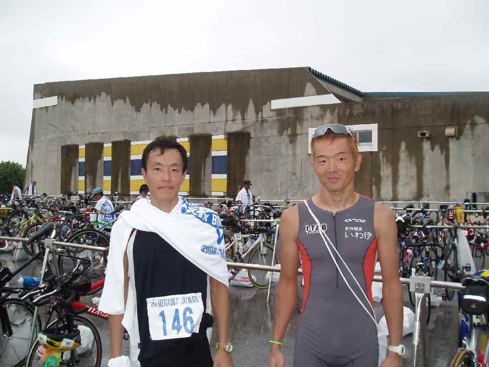 今回はフェリーへは車を積まず、最寄の駐車場(¥500/day)へ置いていき、チャリだけを船に積む。何故かって、フェリーの予約電話入れたのが前日の金曜だから(爆死)さすがにもう車は満席でした。ここらへんにもグダグダ感が現れまくり。 ◆2日目:ただの一歩も踏み出せなくなった日◆公民館近くのバイク→ランへのtransit 2 へラン用の荷物を設置し、スイム&バイクのスタート地点のある伊是名ビーチまでチャリを走らす。バイクをブースへセットし、最終受付を済まし、パワーバーなどを口にして直前のエネルギー補給。スタート時刻が近づいたところでビーチへ入る。開会式に続いて「気合居れ」や、日体大の男子学生による伝統の恒例の「エッサッサ」が自主的に披露され、大いに盛り上がる。スタート時間が刻々と迫ってくる。やべぇ、鳥肌たってきてるし。まぁ入水したら寒いのなんて忘れてしまうんだろうけど。カウントダウンはいきなり「はい、スタートまで既に1分切ってます」。そして午前8:30、カウントダウンより0.3秒早く鳴ったピストルを合図に、トライアスリート600人が伊是名ビーチに飛び込む! <SWIM> 1km × 2周 = 2km − 1周目 −今年はまたしても大会史上最多の参加人数。よってスタート直後のバトルも年々激しさを増す一方である。もはやパンチ、キック、エルボーなどという通常技は当たり前、去年までは痛いと感じていた必殺・真空チョップでさえも全く気にならないほど。恐ろしいのはスーパーコンボで、打撃を立て続けに3発ほど喰らい、体勢を立て直そうと顔を上げたところへ更に顔面キックの追い討ちがかかり、息継ぎができずに海水を飲んでしまうことも。更には複数人による連携技までも繰り出される。これには危うくゴーグルが外れかけた。 今までならスイムコースの第二コーナーを曲がった後はバトルもひと段落するのだが、今年はまだまだ続く。後ろからも俺の足を引っ張らんばかりに敵が追いすがってくる。 そんなこんなで1周目は自分のペースを全く作れず、フォームに気をつけるヒマもないまま終わる。 − 2周目 − 水から上がると俺の前はかなり距離が空いていた。よって2周目はスタートから広々と泳げた。が、今度は逆に方向感覚が全くなくなる。何度かジグザグ泳ぎをして、やっとロープとブイを見ながら泳ぐのに慣れてくる。ここらへんから、やっとフォームに気が回るようになった。手を前方に大きく伸ばし、ゆっくり大きく掻く。周囲の選手と比べて、少ない掻き数で同等以上のスピードで泳げるよう心がける。コーナーはポールの土台が大きくなっているため、自分が集団の先頭でも間違わずに方向転換できる。2周目の後半、周囲にいた選手たちが後方に下がっていき、前の集団が近づいてくる。いつもこんな展開やね。陸地が近づいてきて、水深が浅くなり、立ち上がる。「38分!」というアナウンスが聞こえた。ヨシ、去年と同じペースで来てるぞ。 - Transit 1 - 口の中が塩っ辛いため、黒糖を一個口に入れる。バイクブースへ行くと、同じラックにはまだほぼ全てバイクが置いてある。俺は総合順位に比べてスイムだけちょい速めだからね(なんぼのモンじゃないが)、だいたいいつもこうだ。着替えにもたついてる間に隣の女子選手が上がって来た。な〜んか忘れ物してないか気になりつつ、バイクを押してスタートラインへ。よっしゃ、行くぜ!<BIKE> 13.5km × 約5周 = 66km − 1周目 −バイクスタート直後、一番気持ちいい瞬間。まだ全然疲れてないからグングン速度が上がるし、周囲に選手が少ないため「まだ上位にいるぜ」って感じがするし(少なくとも、この時点では)。スイムで身体が冷えて最初のうちは指先が痺れたりしてるが、それはすぐに忘れてしまう。しばらくすると後ろから集団が。まだ周回遅れではないな。 お、あのゼッケン番号はKATO氏だな。スイムでは俺より後ろにいたのか。 今回は予想に反して島の南、港周辺が向かい風となっていた。バイクチェックポイントの手前、鋭角に海のほうへ曲がると、一気に向かい風。コーナーで減速したあとだから加速がキツイ。 まずは1周目終了。早くも練習不足が出てきたか?1周目だというのに「全くの余裕」ではなくなっていた。 − 2周目 − 前回はレース中の補給をしすぎて腹が苦しくなってしまったため、今回は若干控えて行く。水を取るとスッと楽になるのは知っているが、最初のエイドステーション素通り。3周目から摂る計画だ。 バイクスタート地点を通過、今バイクゲートから出てくる選手もいるくらいだから、俺もけっこう速いじゃん?と思ったのもつかの間。後ろから速えぇチャリが来た。ゼッケン番号「1」。え〜〜っ!?もう周回遅れなん??まだ2周目の前半なんスけど(笑)速過ぎだろ? 島の北西の平坦なコース、路肩に選手が3人ほど停車していた。うち2人は肘を押さえて顔をしかめていた。接触して落車したんだな。気をつけないと。。。 早くも披露が見え始めていたため、前輪ギヤを1速にしてその