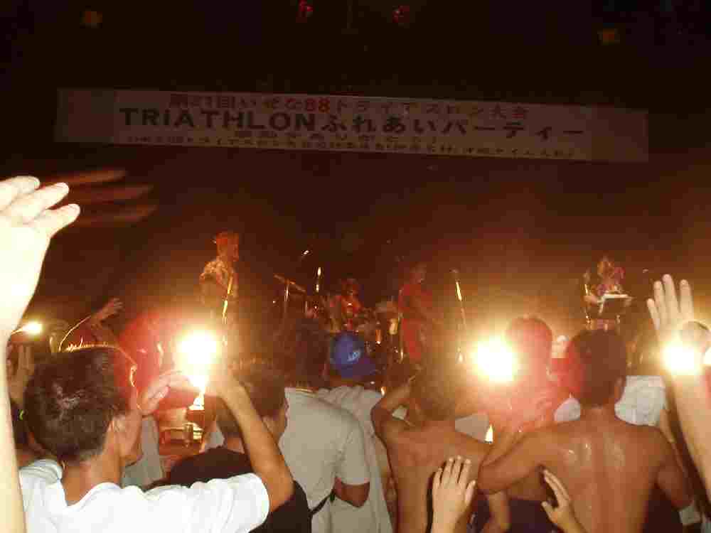 <第4種目:ふれあいパーティー> (ビール+泡盛+飯) × ∞=65,535km 公民館へ引き上げ、シャワーを待たされた挙句にやっと浴びて、速攻で布団に大の字になる。くぅぅぅ気持ちいいぜ。。。チャリも他の道具も片付けずに放置。・・・寝て起きたら体育館はもぬけの殻。俺も急いで体育館へ足を運ぶ。一足先に会場へ向かったIWAI氏&KATO氏と合流。 今年のふれあいパーティーは去年の失敗を生かし、表彰式開始前から飯を食べることが許可された。今年で21回目を数えるにもかかわらず、決して甘んずることなく常に改善する努力を忘れない実行委員会に敬意を表する(笑) 表彰式が終わり、最後に千葉さんから注意事項が。今大会は今までほとんどなかったドラフティングが多かったそうだ。上位の選手が何名かゴール後に失格になったようだが、そういやバイクでそれらしき6〜7名の集団を見たっけな。あの連中だったのだろうか? IZENA88トライアスロンはここ数年で参加者が爆発的に増えた。それはこの大会がチョ〜楽しいというウワサが雑誌や口コミでトライアスリートたちの間に広まったことが原因だという。参加者のレベルも年々上がり、強化選手になってる人が出場するまでになっている。沖縄の片隅の小さな離島にもかかわらず、大成功してる大会だ。 んがしかし。これ以上巨大化せずに、今のままアットホームな大会であって欲しいという気もする。俺レベルの人間が言うのもなんだが、狡いテク使ってまで勝ちに拘る大会じゃないと思う(もちろん、良い意味でね)。