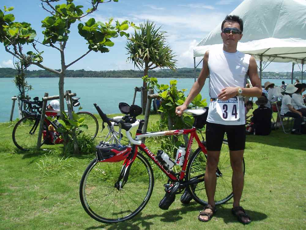 マジメに練習をするようになってから、今回が初めてのトライアスロン大会。そして先日買ったチャリ、PINARELLO FP2のデビューレースでもある。ってことで、かなり楽しみ&気合入っていた。ついでにビンディングペダルもDHバーもサイコンすらも、レースで使用するのは初めてだったりして・・・orz <SWIM> 0.75km × 2周 = 1.5km 今大会のスタートバトルは俺のトライアスロン暦の中でも最も熾烈を極めた。スタートした直後に顔面キックを喰らい、ゴーグルに海水が入る。真隣を泳いでた選手は完全にゴーグルがズレてしまい、立ち泳ぎして直してたし。他選手たちの殺る気が漲ってるのが強く感じられた。100mくらい泳いだ時点で「やべぇ、疲れた」と感じたほど。このスタートの混乱、遅い選手が前のほうからスタートしたのも原因では?アナウンスで、 「スイムに自信のない人は後ろのほうからからスタートしてください」 とは言っていたが、明らかにフォームがメチャクチャな人が俺の前泳いでたし。俺は前から2列目くらいに陣取っていてもよかったのかも。 そんなわけで1周目が終わり、2周目の入水したときにはへばってた。それでも、やっとバラけてきたのでフォームを意識して泳げるようになる。と思ったらこの期に及んでバトル再開!ロープ側がガラ開きだったのでそっちに寄って、あとはスイムFINISHまでほぼ独泳。 2回あるコーナーではブイを固定してるロープを使って”クイックターン”もキメる!(笑)一定のペースで泳げるようになって、むしろ後半のがラクだった。 - Transit 1 - 今回は目標タイムもあるのでトランジットもダッシュ!しかし陸橋のスロープを駆け登るので息切れしてしまう。走りながらウェットの上半身だけ脱いでおく。陸橋を渡るときに見下ろすと上位の選手がポツポツと出て行っているが、まだまばら。心配していた着替えはあまりモタつかずにできた。それでもSWIMはここまでで31分以上もかかってしまった。大誤算。BIKEスタート!<BIKE> 10km × 4周 = 40km いつもならバイクに入ったとたんにガスガス抜かれていってしまうのだが、今回は違う。後ろから追ってくる気配もない。この日は西南西から風速2mの風。与那城の基点で折り返すと追い風へとかわる。スピードがグングン上がって爽快!40km/h近くまでラクにスピードが乗る。しばらく走ったとこで股ズレし始める。前日買ったばかりのNEW海パンを下に履いていたのだが、これが一昔前の競泳選手も真っ青のピチピチセクスィークイコミブーメランで少しキツいようだ(今まで使ってたのと同じサイズなのに、why?)。が、酷くなることはなく、じきに忘れてしまう。あとバイクでスタートしてしばらくはDHポジションがキツくてしかたがなかったが、慣れてきた。最初はこれがキツくて吐き気まで催してたのに。まぁ初めてDHバーを練習用チャリにつけたときもそうだったか。結局は慣れなんだな。 平安座側で折り返すと再び向かい風。しばしの辛抱だ。キツくても軽すぎるギアにならないよう、100rpm前後で回すように心掛ける。ケイデンスが測定できるタイプにしておいてよかった。それでもきつくなってきたときは水飲んで身体も気持ちも一旦仕切りなおす。 1周目・2周目はバンバン抜かされるようなこともなく快調に飛ばしてきた感じだったが、徐々に後ろから集団が追い上げてきた(注:折り返しのときに確認できるので距離が詰まってるのがわかる)。後半は「橋」の部分の坂道ではダンシング使ってスピードキープ。それによって前の選手を抜いてしまう場合も。ここでは通勤チャリの本領発揮。 4周目、トップの選手たちは既にRUNに入っていた。TREKのTTバイクの選手とデッドヒートになる。あとやたらガタイの良い選手。この人もディープリムのカーボンホイルを装備したTTバイクだ。しかし俺も負けちゃいない。上り坂では立ち漕ぎを使って抜き返す!別にチャリで勝ったからって勝ちが決まるわけじゃないのに、やはり少しでも前へ出ようという本能が働くのだろうか。最後の下りを利用してシフトアップして加速。さすがにシンドさは感じ始めていたが、ちゃんと最後まで集中して走れた。 さて、FNISHは練習したNSGO(意味不明?)を実践してみる。前にリハした通り、”標識”の二つ手前の街灯を過ぎた辺りからシューズを脱ぎ始め、シューズを踏んづけてペダルを漕ぐ。 - Transit 2 - NSGOで降車。込み合ってたらやめようかと思ったが、後ろから選手が来てる気配がなかったのでやってみる。完璧ではなかったが、できた!そのまま走ってバイクブースへ。勢い余って自分の番号のとこを通り過ぎて、ちょいバック。ランシューズに履き替えて帽子を被って、鼻かんで(←重要!)、補給用のゼリーを口に含みながらスタート。<RUN> 10km × 1周 = 10km 今までみたいにバイクでヘロヘロになることもなかったので、いい調子で走り出したが、やはりしんどい。それと、バイクで水分取りすぎたのか、腹がパンパンだ。かなり暑かったから頻繁に飲んでいたのだが。しか