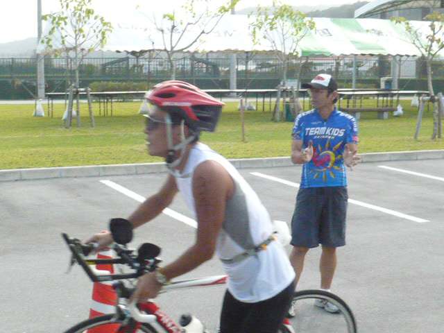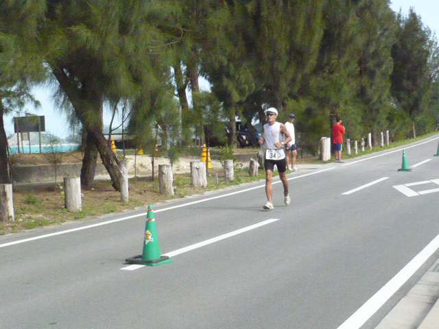 あやはし大会では真ん中あたりの位置からスタートして最初全然前に出られなかったので、その反省を踏まえて最前列からスタート。飛び込んでしばらくは左右から挟まれそうになったり、後ろから足引っ張られそうになったりしてたが、ここで前に抜け出さなきゃダメだと思って、少し強引に前に割り込む。いきなり息が上がるが、距離短いんだからこれくらいしないと。甲斐あって最初のブイに着く前に前方が開けた。ブイを回って前方確認すると、数名の先頭集団がいるのみ。よし、やっとこイイ位置につけた。あとはいつも通りマイペースで・・・と思っていたがが、隣に一人ぴったりついてる選手がいたので、そのままペース維持でくらいつく。一人だと進行方向見失う可能性もあるし。この選手とずっと競いあって併泳。 - Transit 1 - スイム上がった時点で6位!しかし着替えでのんびりしてる間に3人くらい抜かれる。みんなどんどん出て行く(汗)焦ってしまいナンバーカードベルトつけないで出発しそうになり、スタッフに注意され更にもたつく。バイクにまたがるもペダルにシューズがはまらず三度もたつく。短距離のレースになればなるほどトランジットのロスの割合は大きくなるんだからねぇ。ちょっとは考えないと。 <BIKE> コース3周 + α = 20km スイムで珍しく息があがってたので走り出してしばらくシンドかったが、スピードが乗り始めるとそれも忘れる。この大会の会場である辺戸名はほんと過疎地といった感じだが、オクマビーチホテルの前だけはリゾートの雰囲気が溢れている。それも一瞬ですぐに田舎になる。信号機のある"交差点"は逆バンクとのことで、手前で十分スピードを落とす。その先は北向きに海沿いを走る。 ぶわぉっっ!?すげー向かい風。ここ数日、台風12号の影響で強烈な北風が吹いていた。海も大荒れ。ここでは30km/hを割ってしまうことも。R58手前で折り返すまでしばしの辛抱だ。 ぐるっと折り返すと国頭村のメインストリート&住宅街。風が止み40km/h近くまでスピードが上がる。応援も一番多いしトライナルシストにはウヘヘなポイント。信号機の"交差点"に戻って左折。ココはコーンで誘導してるが少し分かりづらくて1周目のときは間違えかけた。畑の間の川沿いコースも風はないのでラクラク。短いが景色がめまぐるしく変わるとっても楽しいコースだ。川がぐるっとカーブしてオクマリゾートの通りに出る。これで1周終了。