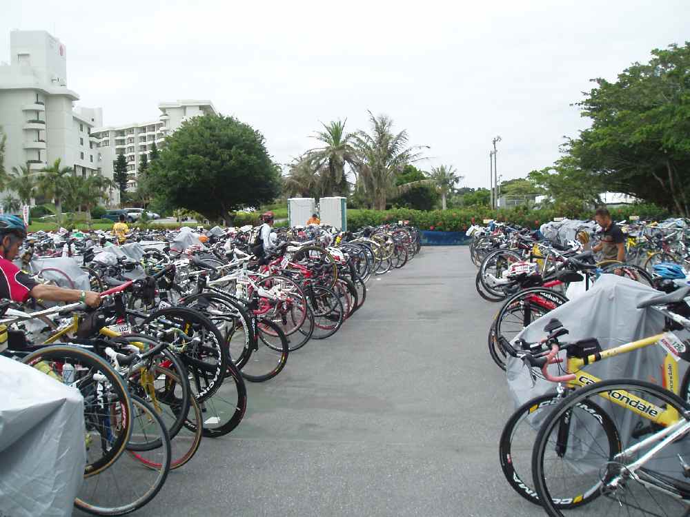 立ち上がり、砂浜を走る。けっこう長い。タイム表示を見ると53分台。早くても55分と思ってたので、うれしい誤算。シャワーは混んでたのでスルー。トランジットはまず袋だけを取って着替えエリアまで走る。そこでスイム器材を脱いで袋に入れ、搬送トラックのスタッフに袋を渡してバイクエリアへ移動する、という手順。よく把握してなかったが、周りの選手のマネしてスムースに行った。