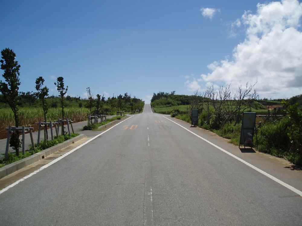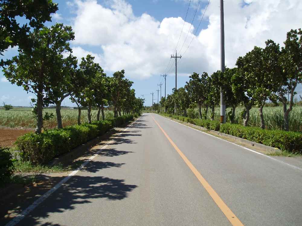 並木が続く緩やかな下り坂を過ぎると、サトウキビ畑が広がる。来間島方向へ左折。
