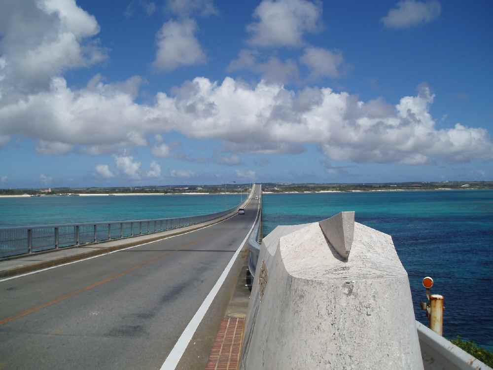 <写真8>池間大橋。長いコース中でも一番のポイントだろう。360度、エメラルドブルーの海が広がる。晴れていれば。
