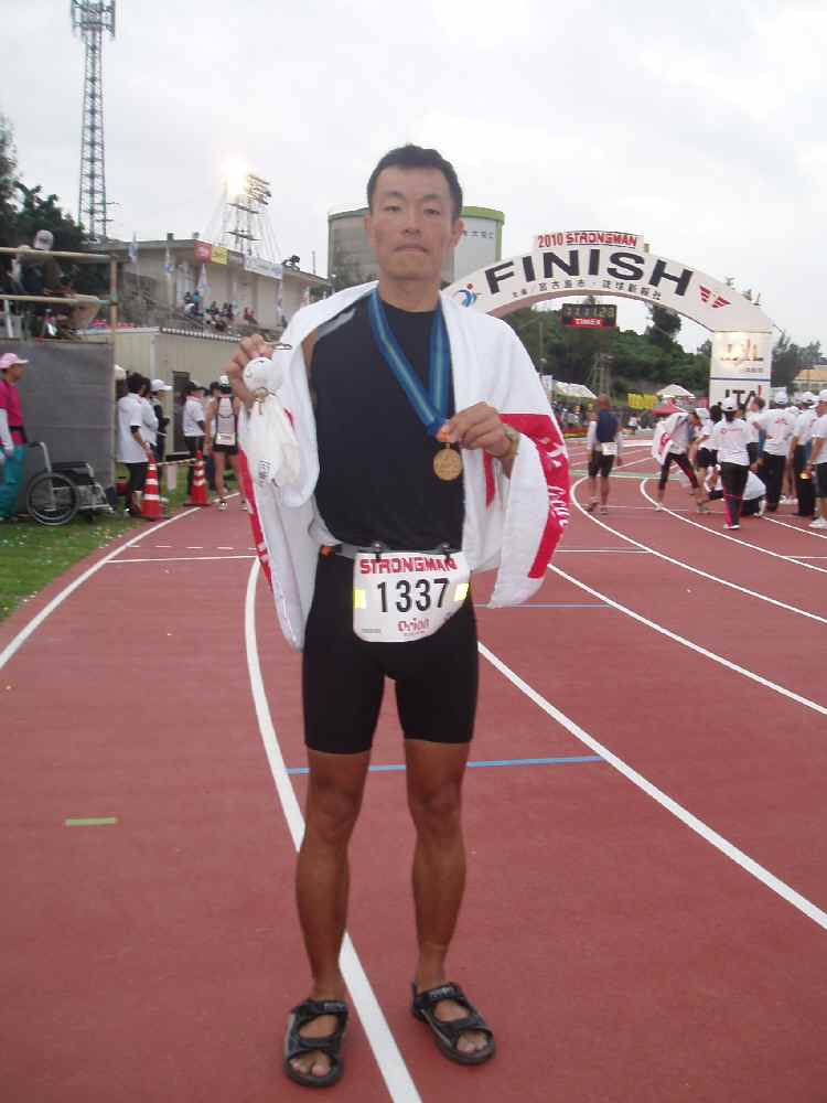 競技上入り口でサングラスをとって、そのままスパート。ラスト400mは今までに走ったどのトライアスロンよりも、どのフルマラソン、ハーフマラソンよりも速かった。ゴール前100mは島の子が伴走してくれたが、ついて来れるか心配だった。