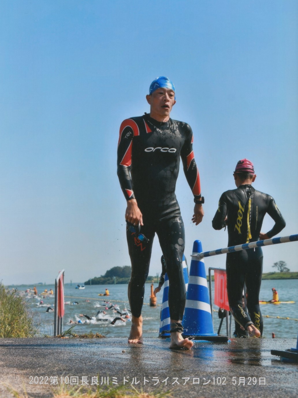 トランジション入り口で受付してバイクラックへセット、着々と準備。早目に到着したつもりだったが、スタート時間はすぐに迫ってくる。いよいよ、始まる。 <SWIM> 1km × 2周 = 2km スイムは上流向きに500m先のブイまでの折り返しを2周。スタート地点の30mほど下流からエントリーし、ウォームアップを兼ねてスタート地点へ移動。水温18度、ウェットは2mmフルスーツ。入った瞬間は冷たいっ!って思ったが、まもなくそんなことは忘れる。清流・長良川と言われているが、さすがに下流では透明度は1m程度。でも水はドブ川の味がしなくてよかった(ったりめーだ)。川スイムは初。水上スタートも初。スタートは8:00、ただし2分置きのウェーブスタート。オレンジ・白に続き、俺は青スイムキャップの第3ウェーブ。4分後にスタート! とにかく2軸をぶらさないこと、グライドを大きく入れることを意識。フォームがしっかりしていれば、スローピッチでも少しずつ前に出ていける。水中の視界は沖縄の海とは比べるべくもなく、度々顔を上げないとすぐに斜めってしまう。スタートバトルがひと段落し安定してくると、まもなく第2ウェーブの白キャップに追いつき始める。500m先の折り返しブイまではけっこう長く感じた。折り返し地点は当然バトル再開(笑)。復路に入ると第1ウェーブのオレンジキャップに追いつき始める。ロープ沿いが泳ぎやすいので、ロープから離れないように泳いでいたらブイに顔面から激突。ブイはバルーン式ではなく固い素材で、けっこう痛かった。