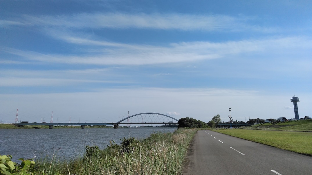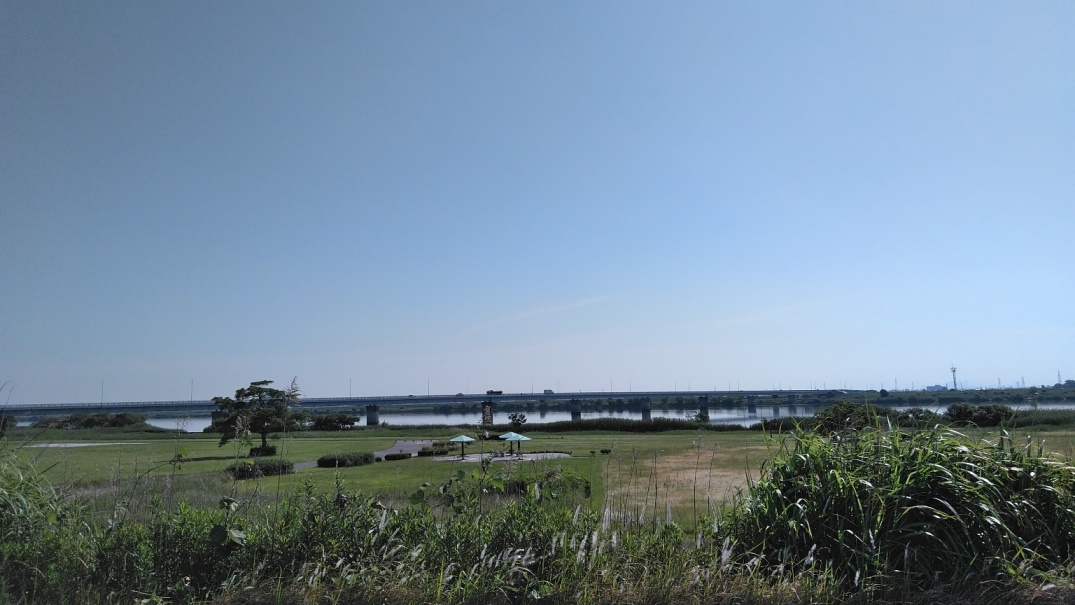 立田大橋を過ぎたところで河川敷に降り、駐車場へ停める。パッキングした自転車を組んでると、隣にも参加者が。少しおしゃべり。やはりコロナ以降初参加で、約3年ぶりだとか。組み上げたチャリの調子を見るのも兼ねて、河川敷を北上。河川敷のテニスコートが会場で、トランジットエリアになっている。少し北風があるが、翌日は弱まる予報。ただし気温は30℃超の予報・・・。