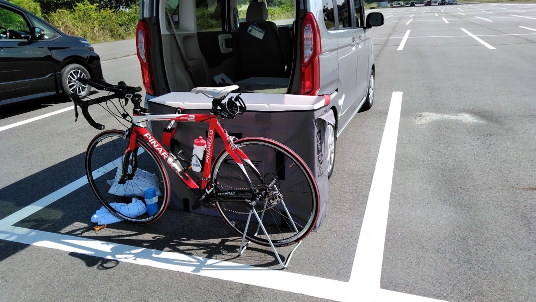 <写真2>会場近く、長良川河川敷の駐車場でパッキング解除。チャリ組み立て。