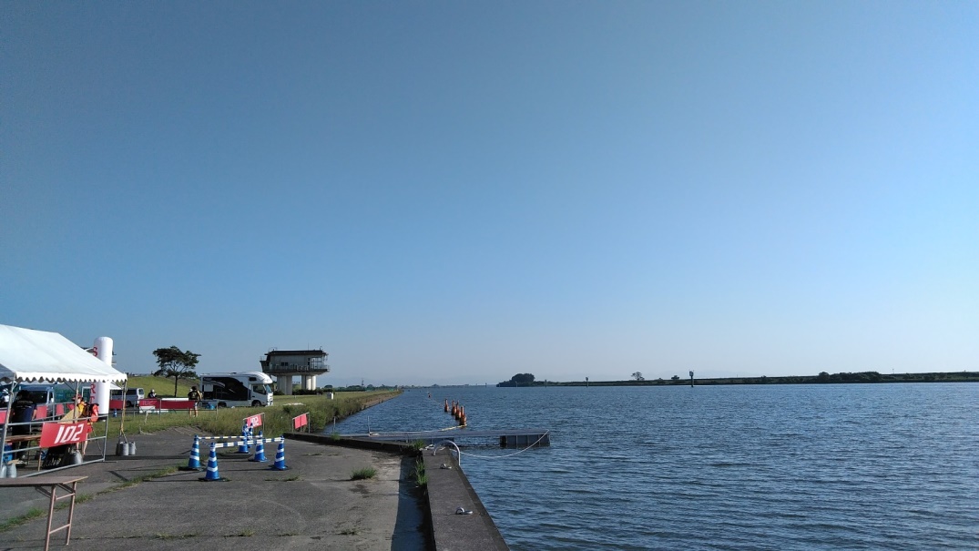 - Transit 1 - 楽ではなかったが、心配していたほどアップアップにはならなかった。フラフラするので、前の選手に続いて歩いて移動。トランジットはウェット脱ぐのに手間取る(大会でフルスーツは初)。ガーミンもアンクルバンドも一旦外す必要があった。レーパンは2枚穿き。慌ててたのでラックからチャリを倒してしまう。<BIKE> 12km×7周 = 84km バイクコースは長良川河川敷のため完全フラット。ただし道幅は狭く2車列程度なので追い越し・・・というか俺の場合、追い越されに注意が必要。あと舗装路とはいえ河川敷なので、路面がボコってるとこもちょくちょくあり、快適ではない。往路北上時は若干の向かい風でややきつい。あと上流へ向かっているので、僅かながら上りにもなっているはず。折り返すとDHポジションで35kmくらいまで上がる。が、折り返し後は水たまりが多い。直進だから大丈夫だろうけど、水たまり通過時は毎回ヒヤヒヤもの。脚に泥水が掛かるのを感じながら通過。 周回折り返しはけっこうタイト。俺はバイクスキル低なのでシャープなターンはできず大廻り。後続の選手にインを突かれる始末。 1周目こそ集中して走れていたものの、2周目には疲労感が。そしてDHポジが異様にキツい!肘パットが微妙に内向きになっているようだ。輪行時に外す必要があったのだが、組むときにちゃんと確認しなかった。徐々に慣れはしたが、余裕がないときにコレはきつい。