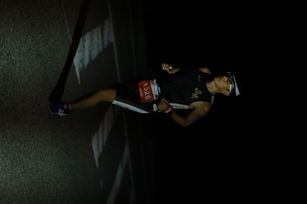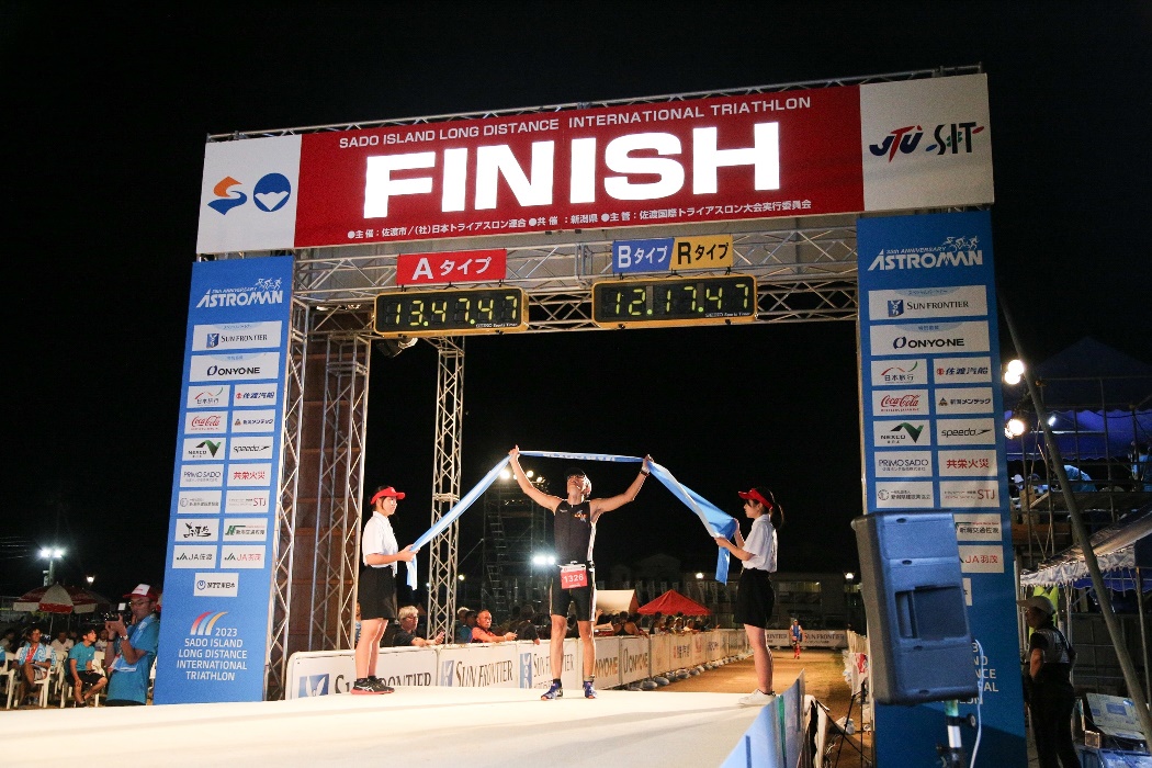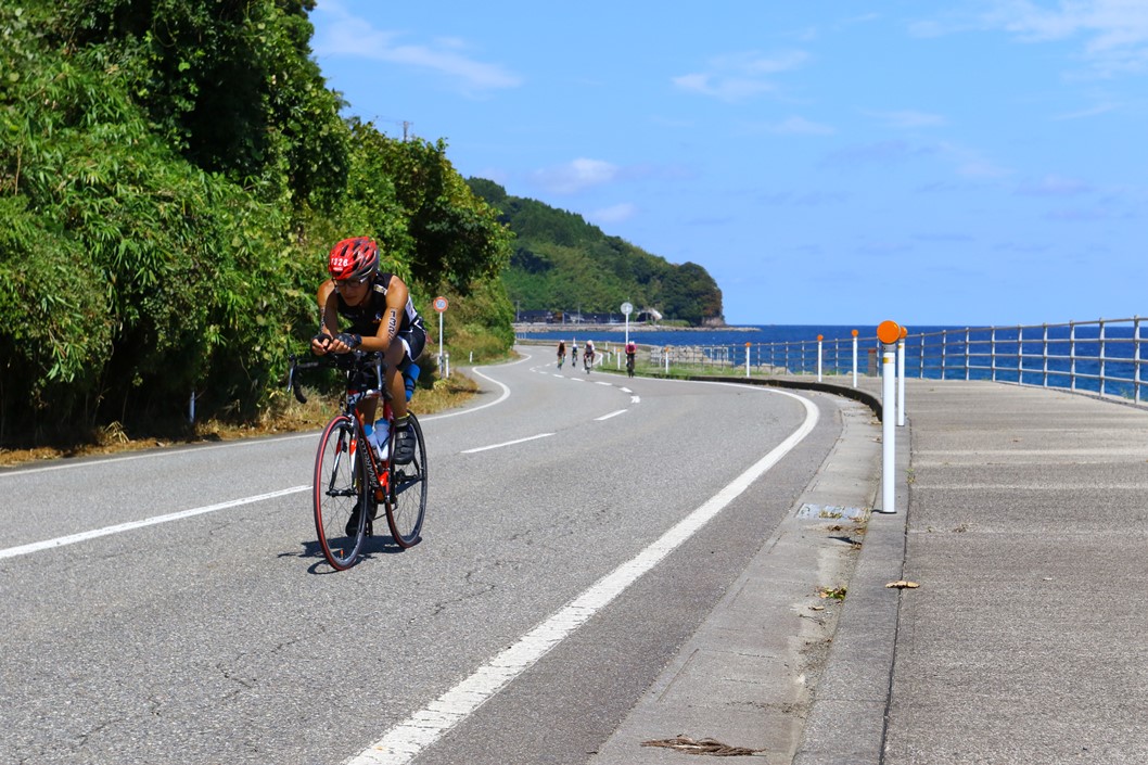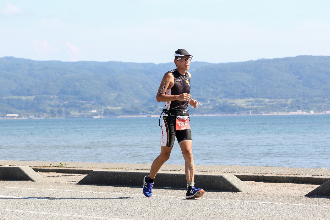 朝2:30起床。起床時間も過去最早。4:00前にアストロマンバスがホテル前に迎えに来るので、この時間から準備を開始。朝飯はホテルが用意してくれたお弁当。ボディナンバーシール貼ったり、ワセリン塗ったりと準備。 アストロマンバス乗車するが車内はシーンとしている。なんなら寝てる人も(応援者の可能性もあるが)。4:30過ぎ、佐和田バスステーション到着、ここから徒歩で会場・佐和田海水浴場へ向かう。 まずは隣の体育館でボディナンバーチェックを受けてスイムキャップをもらう。バイクブースに、バイク・ランで使用するものをしっかりセット。近くの選手からクラゲ除け&日焼け止めのクリームを分けてもらい、顔に塗りたくる。うなじへのワセリンも7月のOWSに次ぐ史上2位の量を塗りたくる。軽く菓子パンとKODAでエネルギー補充。 5:15過ぎ、スイムチェックのためゲート通過して海岸へ降りる。今回はスイムだけは自信あるのでしっかりやっておく。っていうかウェット着て待ってるだけで汗ダクになってるので入水しないと耐えられない。その後上がってスタート地点へ移動。予想タイム85分くらいの位置、且つバトル嫌なので外寄りに陣取る。スタート列が幅広いので遠慮せず前ぎみでもいいか。スタート前セレモニーで松田丈志さんが再度登場。昨年はAタイプ、今年はBタイプ出場とのことで、 「昨年自分も完走したとはいえ、それでも、改めてAタイプに出る選手はホントすごいなと思います!」 とのコメント。自分も未知の距離になるが、「制限時間目いっぱい」を目標にしたので、緊張感は全然なかった。 さぁ始まる!! <SWIM> 2km × 2周 = 4km 朝6:00、先ずはAタイプが一斉スタート。長いレースなので焦っても仕方ない、周囲もいきり立っている雰囲気はない。海岸はけっこう遠浅で腰の深さまで来てもまだ歩いてる人も。コース幅も広いのでバトルも激しさはまったくなく、スムースにスタートできた。とにかくストロークを大きく。「隣の選手と同じスピードで、ストロークは少い」これを目安に黙々と進む。コースは沖合の2個のブイを回って戻ってくる三角コース。2個目のブイを回ると東向きになるため、朝日が眩しい。1周目ラスト、徐々に水深が浅くなりゴロタ石のとこまできたら突如として大量のクラゲが出現!顔をバリバリ刺されまくり。こりゃ初の体験。スタート前に「ウェット着用を強く推奨」とアナウンスしていたが、間違いない。最初の2qは36分台、スイップストリーム状態なのもあるだろうけど、想定外に早かった。 2周目。1周目楽々だったので自信を持っていけた。うなじズレも発生しておらず、ストレスなく泳げている。序盤より選手がまばらになり、斜めってしまうことが増えたか(俺が曲がってるかと思ったら実は隣の選手が斜めってるなんてこともしばしば)。2個目のブイを回ってまもなく、集団を抜けた形になった。前集団とだいぶ水を開けられている。フィニッシュまでに何とかアレに追いつくのを目標とする。終盤のクラゲに身構えたが、1周目で1,000人近い選手に掻き回されたためか、グッと数が少なくなっていた。1周目は周囲の選手に釣られて早めに立ち上がってしまったので、2周目は座礁寸前まで泳いでEXIT。 - Transit 1 - スイムアップ1時間14分台、予想以上の好調な滑り出し。疲労感も全然なし。足に響くので固い舗装面はあまり走れず。道路に設置のシャワーでウェットを全部脱ぐ。トランジションエリアに入っていくと、前方の選手がゴーグル落としたので拾ってあげる。エリア内の芝の上はやわらかいので走る。例によって相当数のバイクが未だラックに置かれている。ヘルメット、ゼッケンベルトと装着。そして今回はサングラスではなく眼鏡、これも初めて。ランゴールが日没後になりそうなのと、バイクコース中の佐渡の景色をしっかり拝みたいのが理由ね。トランジションタイムは7分ちょい。<BIKE> 190km 佐渡島一周の旅がスタート。レースでは走ったことのない距離、でも不安より楽しみな気持ちのほうが大きい!この日の風向きは朝方が北東風、徐々に北北東へ変わっていく予報。つまりバイクコース中盤、佐渡北端から南端の小木までの100km近くが追い風基調となる。神である。ってことでスタートから佐渡北端まではやや向かい風になるのだが、東側が山で遮られているためか、風のキツさはほとんど感じなかった。無理のないペダリングで30km/h前後をキープ。 このあとのランコースにもなっている海岸線を離れると、早速緩やかなup/downが始まる。無理せず、えっちらおっちら登っていく・・・とリアディレーラが外れてしまいチャリを引いている選手が。見たことない状態だが、今ここで起きちゃうか。他の選手も190kmの序盤から無理はしないようで、けっこうゆっくり。早くも「上りでブチ抜き・下り&平地でブチ抜かれ」の様相。 20km、最初のエイドでアクエリボトルをもらう。ズンと重みが増す。約0.5kgアップ、現ホイールと旧ホイールの重量差くらいあ