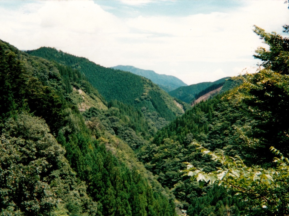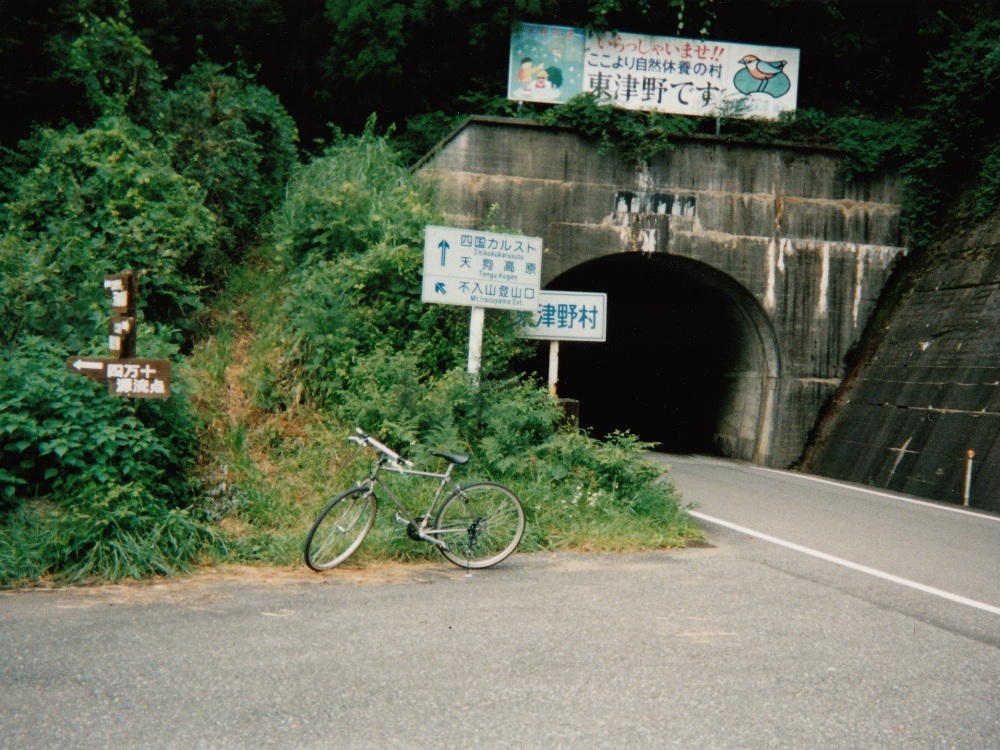 本当にこれが県道か?と思うほど細い道を走り、那珂川へ突き当たる。川幅は広く、深い。そしてなぜか水が泥水。そして早くも沈下橋が見られた。この川を左手に見ながら山登りが始まる。行く先を見上げれば、地図見て予想していた通り、果てしなく青い山々が連なっている。 R195、高知へ向けて四ツ足峠アタック開始!行くぜっ!! ・・・しかし標識には「高知135km」の文字が。本当にこの山を越えられるのだろうか? 周囲は農村のようになってきた。ロープウェイのある道の駅で小休止。お遍路の女性がいて少し話す。今日は上那賀まで歩くと言っていた。ちなみにこの当時、お遍路というものの存在を知らなかった俺は、服装からしてこの人は山伏だと思っていた。 とにかくすごい田舎、すごい山奥。高校の分校まであるぞ。あと「おとりあゆ」を売る店が多数みられた。民家はちょくちょくあるが、ほぼ上り坂。UP・UP・UP・FLAT・UP・FLAT・超UP・UP、みたいな感じ。途中にダムが。ここからしばらくの間、このダム沿いに走ることとなる。川の濁りはこのダムが原因のようだ。しかしダムに流れ込んでる小さな沢の水は恐ろしいほどに澄んでいた。ダムの水の色との対比もあって、沢の水の色は透明な水色に見えるほどだった。ダムにかかる橋を渡って対岸へ。対岸の道は木がせり出していて暗く、途中にあった小さなトンネルも電灯がなく暗い。交差点にある商店で休憩。この交差点付近は少しだけ民家があるが・・・どうやって生活してるんだろう。