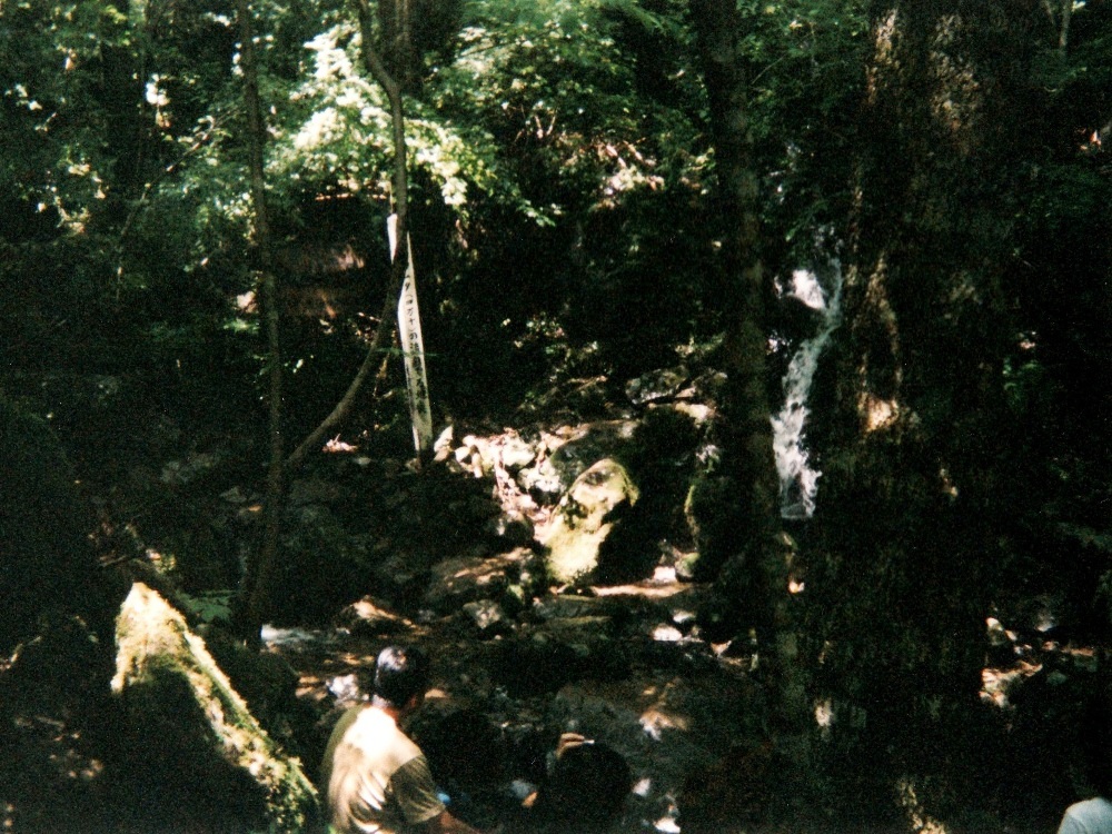 途中に山肌から湧き水が流れ出している場所が。けっこう水量があるらしく、道路っ端に洗面台みたいなのが据え付けられて、そこに一旦水が溜るようになっていた。当然、着ている物をびしょ濡れにし、絞って頭から冷水を被る。
