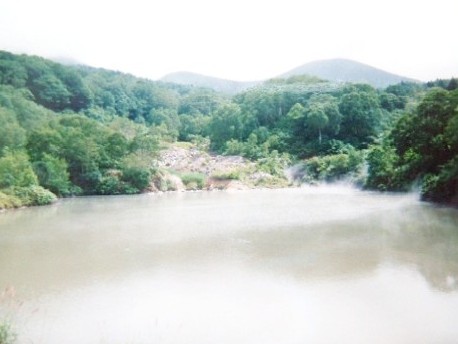 <写真4>国道の真横にある地獄沼。立ち上る湯気と溶けた岩はまるで地獄のよう。