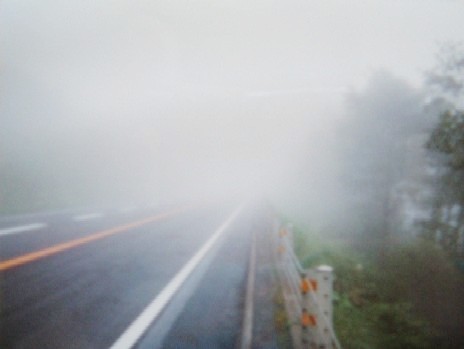 <写真3>峠のトンネルを超えると深い霧に包まれる。