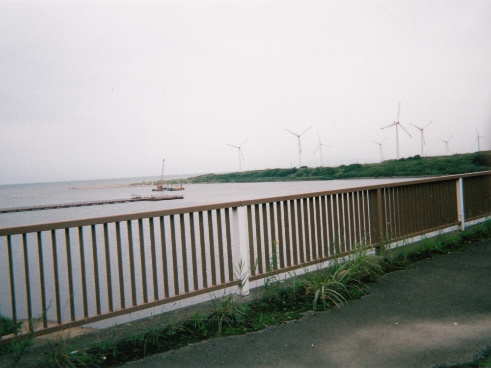 雄物川を渡る。発電用のデカイ風車が見える。すぐ近くでみると恐ろしい。 |