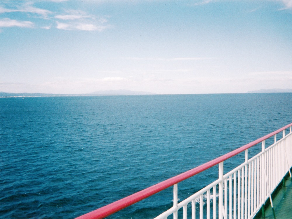 フェリーターミナルではイマイチよく寝られなかった。4:30頃に起きて24Hのラーメン屋で味噌ラーメンを食べる。なかなか 警備員:「ここは通路ですから」 と立ち退きを命じられたので、寝袋を畳んでベンチに座る。その後、12:00の受付開始まで、ジュース飲んだりマップ見たり海を眺めたりしてターミナル内でダラダラと過ごした。そしてやっと受付。12:30頃、3番ゲートへ。歩きの人が入っていったので自分も自転車引いて入っていく。