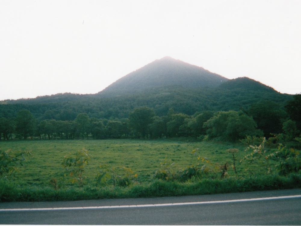 <写真1>出発直後、朝日に映える敏音知山。敏音知=ピンネシリと読みます。最北端を目指し、ラストライド!