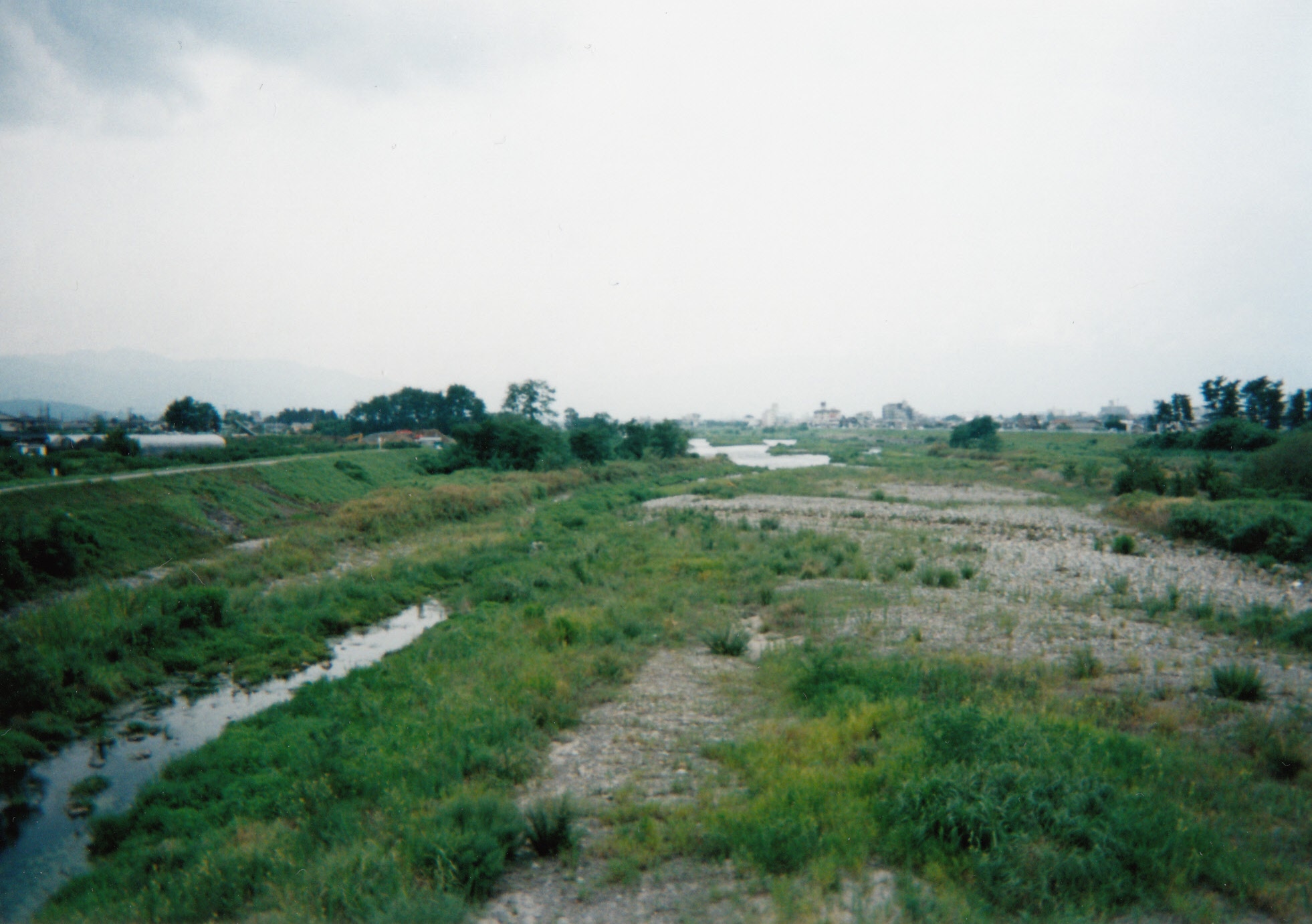 <写真2>甲府盆地、笛吹川。雨が振りだし、ちょっとキツくなってきた頃。