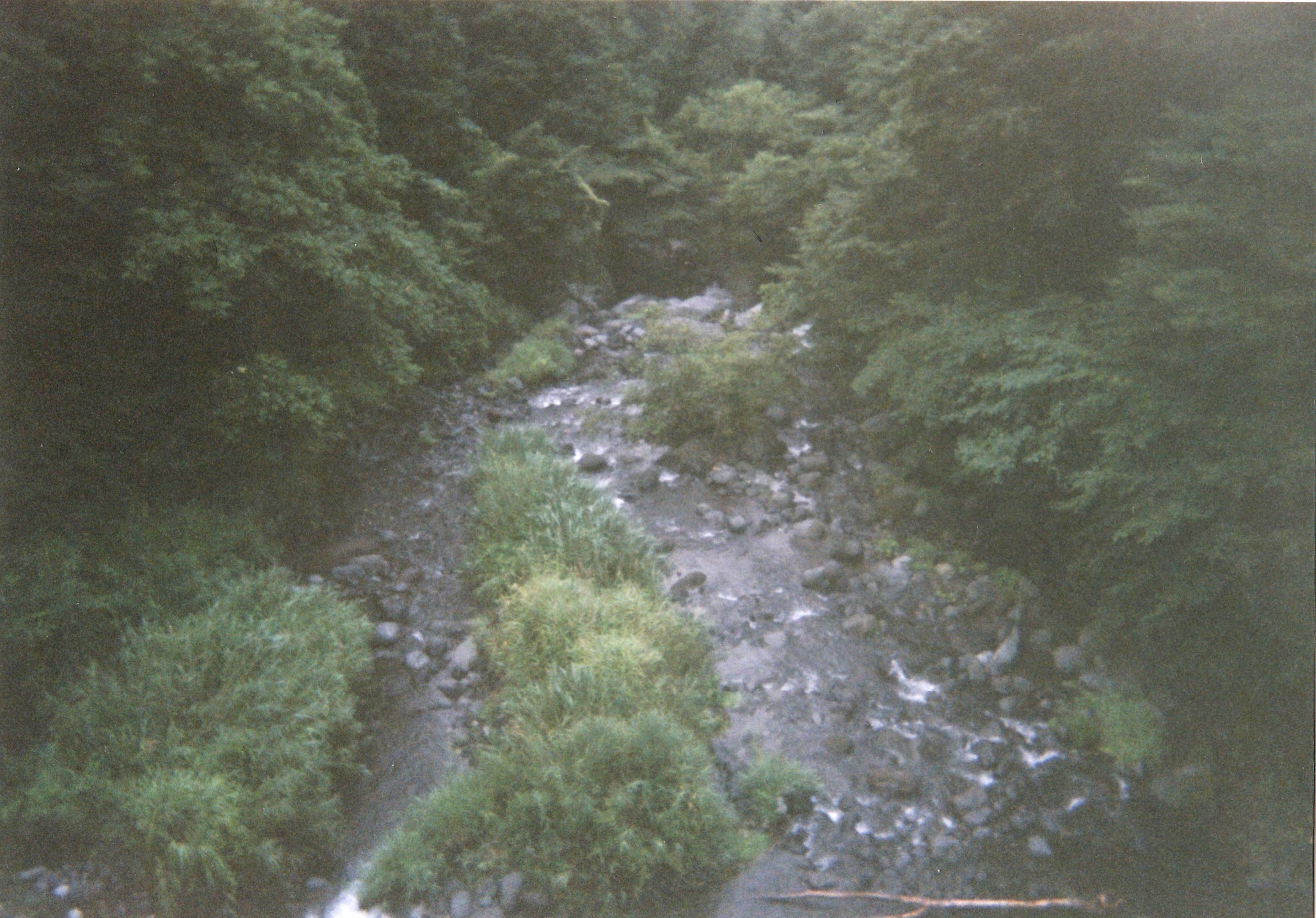 早朝、フェリー待合所のドアが開く音で目が覚める。もう職員が来たか、早いな。メシ食ってゴミ捨てにロビーへ行くと、確かにもう人がいる。公園でトイレに寄ってから出発。 R350はすぐに山道に。いきなりキツイ。車はほとんど通らない。おばちゃん2人が道路の両サイドに別れて空き缶拾いしてる。ご苦労様です。長い上り坂を上り切っても、頂上付近はup/downの連続。にしてもスゲー田舎。田んぼも多い。国道だってのに道幅はどんどん狭くなってくるし。山を越えて反対側の海まで一気に下る。右へカーブして海沿いに出る。海辺は道幅も広い。が、すぐにまた上り坂。なかなかつらいぜ。真野地区に入って少し街っぽくなった。が、歩道が超最悪。なんじゃぁこの段差は?っていうか歩道がガコーンと切れてるし!誰だこれ作ったのはー?バカもーん!!県道との分けれ道は右、県道へ。周囲が開ける、が、相変わらず歩道は使えんので車道走り。上りが多く、平野部に比べたらだいぶ標高が高くなってきた。T字路を過ぎ、右サイドの自販機で休憩。っと、新聞配達のにーちゃんの邪魔をしてしまった。スマネ。小倉川を越える。突き当たり、T字路の正面は神社だった。神社の東屋で一休み。T字路は右へ、学校前を過ぎたら左へ、一気に交通量が減り田舎っぽくなる。セミがうるさいほど鳴いているが、GOODな雰囲気。そして道幅は一気に狭くなる。観光バスが通過するときなぞ大変。up/downもあったがまもなくR350へぶつかる。ってこのT字路、信号なしかよ!しかもR350も歩道があったりなかったり、交通量がすげー多かったりと、サイアク。両津地区に入るまで、イヤな道が続いた。右サイドのSAVE ON で戦前の腹ごしらえ。レジのバイトのねーちゃんは態度もよく可愛かった。コンビニの駐車場でメシ食べてると、ヘリがすぐ近くに着陸。オイオイ、頼むからこっちに墜落して来ないでくれよ。 再出発。ドンデン山方向へショートカットする道を探す。Y字路のとこで少し左に入ってマップ見ながら悩んでると、信号待ちの車のオッチャンが「どこ行く?」と運転席から声を掛けてきて道を教えてくれた。「でも頂上まで遠いぞ・・・」わかってますって(笑)そのまま左へ。繁華街に突き当たる。案内標識を見ると、う〜ん、R350が予想と反対の方向にあるが・・・標識と地図を信じて左へ進むと・・・あった!ドンデン山登山道入り口・左折。いきなりの超上り!左折する手前のGSで給油してた大型バイクがスゲースピードで俺を抜き去って行く。両津高校前を通過、まだ登る。なんかノロイ車やスカイラインが停まってるとこ過ぎると、下り。そして田んぼの中に出る。工事現場があるらしく、ダンプカーが多い。右からの道と合流。ゆるやかに上り続けてるらしく、見た目に反してキツイ。ダンプばかり、路肩に停まってるのもいるし。 川を渡って右へ大きくカーブ、山が近付く。そして左へカーブするあたりから勾配がきつくなる。梅津川はキレイだ。ダンプが通りまくりなので、何度も左に寄って道を譲る。一般車はほとんど通らず。工事現場入り口でも少し停まって休憩。どんどん傾斜がキツくなる。そしてダンプ出入口の先から一気に道幅が狭くなり、ここからが鬼の急勾配! 今旅のラスボス、ドンデン山アタック開始!行くぜっ!! 最低速ギアで立ち漕ぎでノロノロ進んでるが、キツイ!一旦停まって、走り出す瞬間に前輪が浮き上がりそうになる。そして突き当たりのヘアピンカーブでもう休憩が必要になる。沢が流れ出していおり、登山道入口がある。ベトついた手を沢の水で洗い、頭から水を被る。道幅は車がやっとすれ違えるくらい。 ヘアピンを過ぎるとその先はこれまでとは相対的にラクになった。一気に標高が上がってきた。トンボはなんか黒くてデカイやつが多い。カーブがくると勾配がきつくなり、それを越えるとしばらく楽になる。これを延々と繰り返して行く。両津方面が見渡せる路肩スペースで休憩してると、ブーンという音。またスズメバチだ!襲われたら大変、少し走って逃げて様子を見る。
