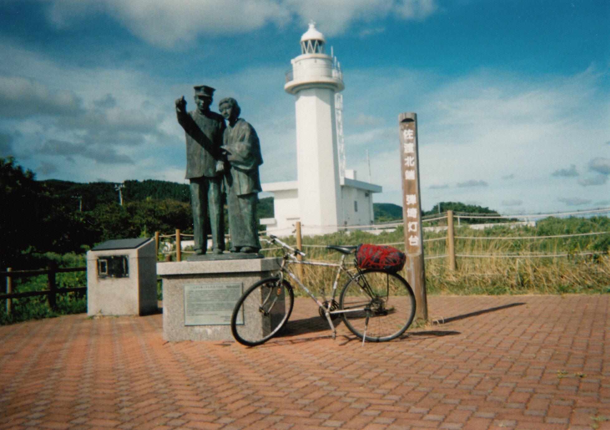 この日はさすがにゆっくり起きだった。宿で寝たの、初めてだな(笑)洗物もパリパリに乾いてて気持ちいい。朝食はまたしても焼鮭に生卵に海苔にいろいろ出たが全て食べつくす。玄関前で2人組みのライダーと少し会話して、7:30頃出発。 いきなり長い坂道(※)。メッチャ急勾配で出発して数分後には海は遥か下になっていた。登坂の途中に小さなぼろいトンネルがある。・・・たのむから崩落とかしないでくれよ。少し下るも基本は上り。なかなか長い。両津まで47kmの標識。谷間にかかる橋を渡る。山間から沢が一気に海に落ちていた。ここも秘境と言っても差し支えないポイント。頭上のすぐ上をトビが通り過ぎてビビらされることも。 海辺まで下ると、岩場と漁村。「サザエ・アワビ・モズク獲りは禁止」の立て札が。伊豆と同じだな。岩場に石橋がかかってるところで、海まで降りてみる。水はキレイだが魚は少なそうだ。トンネルを越えて進むとなにやら前方に小山ほどもあるバカデカイ岩が海にせり出している。「大野亀」だ。手前には畑と草原が広がり、上り坂。上りきったところにドライブイン。案内の看板によるとこの岩は日本三大巨岩の一つらしい。周辺はカンゾウの群生地となっていた。 ※[2012年追記] この坂道が、かの有名な「Z坂」であったことは、このとき知る由もない。国内最長「佐渡国際トライアスロン」に出るなら、バイクコースの難所となるポイントである。 ※[2023年追記] 佐渡国際トライアスロン完走。Z坂、大野亀、小木の坂・・・19年振りに同じ道を走った。 そこから先はup/downを繰り返して徐々に登っていく。二ッ亀。それにしても両サイドとも山や畑が広がり、景色も開けてキレイだ。晴れてくると最高。と、ボチボチ走ってると、早くも佐渡の最北端、弾岬へ到着。あっさり。。。