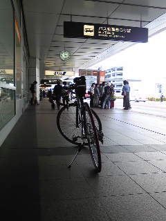 <写真1>羽田空港に俺の練習用チャリ「リタノフ」が・・・不思議な光景だ。 自転車は輪行袋に入れて&保護材でガードして、飛行機に積んで羽田へ移動。輪行袋や保護材はけっこうがさばってリュックにはとても入らないので、羽田空港のコインロッカーでデカいサイズのやつ(スーツケース等を入れる用のやつ)に押し込んでおく。デカロッカーはその分値段が高いが、まぁ許容範囲だろう(俺が使ったやつは1日500円)。でもって到着ロビーの端っこで奇異の視線を浴びながら自転車を組み立てる。飛行機到着は14時だったが少し遅れ、なんだかんだで羽田を出たのは15時30分過ぎ。ヤバイ、もう夕方じゃん。到着する頃には暗くなっちまうなぁ。 っていうか、そもそも羽田空港からチャリや徒歩で一般道へ出られるのか?周辺は全て高速道路っぽいし。ネットで事前に調べたところ、どうやら可能であることがわかった。下記の3つのサイトを駆使すればOKだ。 1.実際に自転車で行った人のブログ(検索すれば一発で見つかる) 2.空港周辺の詳細地図(Yahoo地図等で拡大すればOK) 3.googleのストリートビュー 特にストリートビューの存在は大きかった。歩道がちゃんと続いているか、どこに階段があるか、などが克明にわかる。実際走ったときも、全く初めての場所なのに手に取るように道順がわかって全然不安にならなかった。感謝感謝! ANA(第二ターミナル)の到着ロビーを出たら、左手方向へ歩道を進む。国際線ターミナル(注:2010年時点。ちっこいターミナルだったときのもの)の前に出るのでそのまま通り過ぎると下の道路へ降りる階段が。下りて、歩道を通ってトンネルをくぐり、階段を登ってトンネルの上の道路へ・・・空港エリアをこんなふうに自転車で走ってるって、実に不思議な気分だ。600mほどある長いトンネルを抜けると、やっと空港エリア外といった感じ。ここまで来ると歩いてる人や自転車乗ってる人もちらほら。