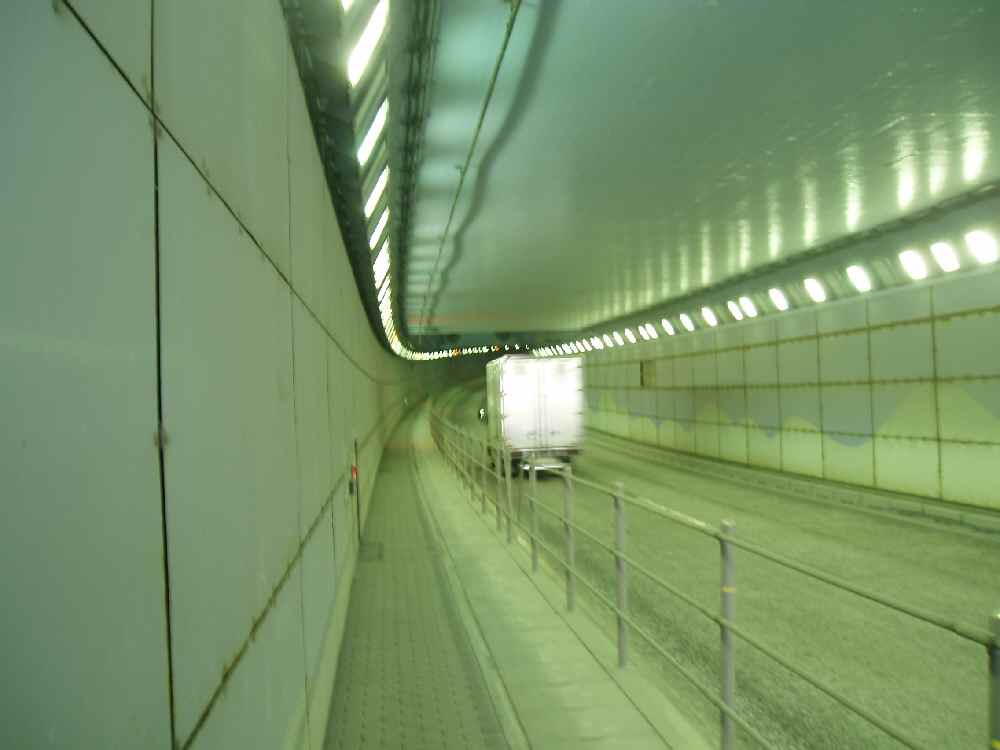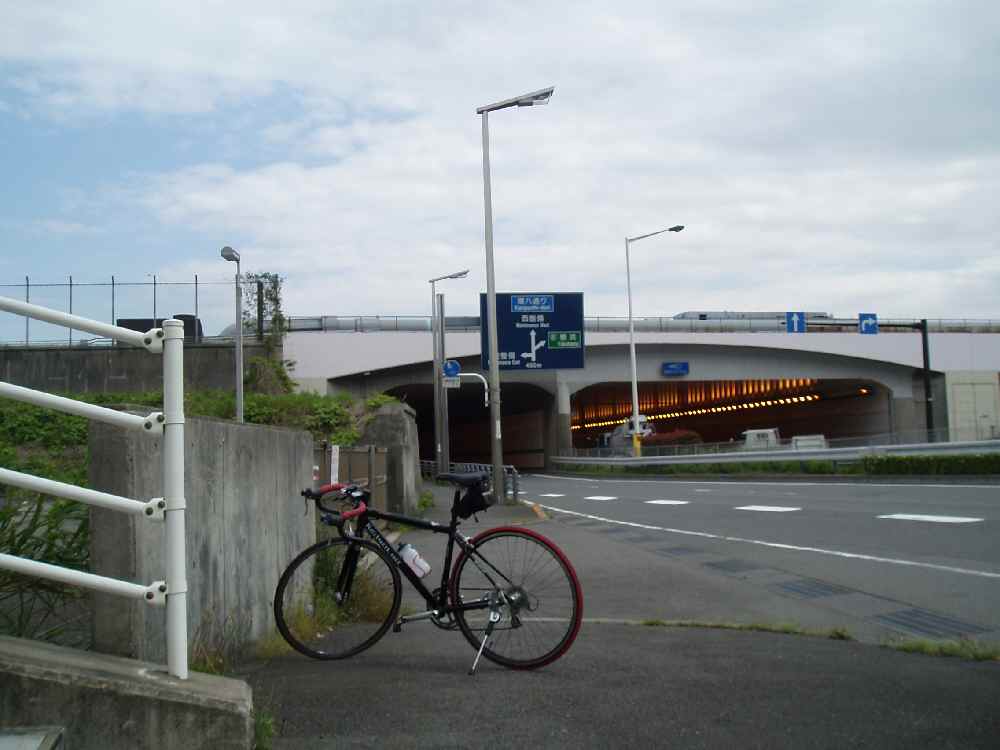 <写真3>このトンネルを抜ければ空港エリア外へ。自動車専用道路っぽいけど、実はチャリ・歩行者も普通に通れる。 弁天橋を通り、下町風情のある細い道を抜け、R131産業道路へ出て右折。道路標識と一緒に現在の気温が表示されていたが、16℃だった。そら寒いわな。昨夜からまともに飯も食べてなかったので、コンビニで補給。ボトル用の飲み物も必要だし。あとタイヤの空気も少し気になっていたので、通り道にあった自転車屋で空気入れを借りて入れておいた(有料だったけどぉ)。そんなこんなで更に時間が過ぎていく。 R15に出て右折、日本橋を目指す。既に4時過ぎで帰宅ラッシュが始まりつつあり、凄まじい人の数だ。沖縄に慣れてしまって、こんな雰囲気もなんだか懐かしいなぁおい。そんな夕暮れのザギンを軽やかに疾走して行く俺の姿がそこにあった(←ナニコレ)。日本橋を過ぎ、まさに東京のど真ん中。車は多いわ信号は多いわでなかなか進まない。しかも車の急な飛び出しや左折巻き込みなど危険はいっぱい、全く気が抜けない。都心を抜けるまで羽田から30km程度だったが、エライ疲れた&時間かかった。 R6へは浅草から橋を渡るのだが、少しフライングして手前の橋を渡ってしまった。まぁ問題ないけど。あとはひたすらR6を直進。右手には建設途中のスカイツリーが。