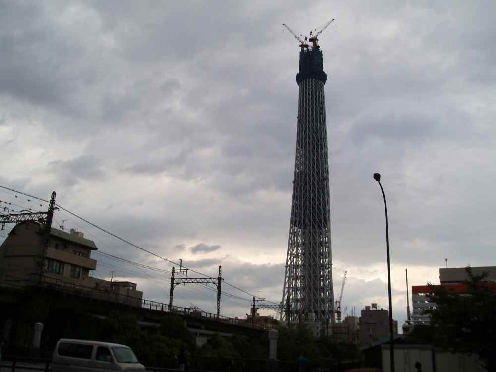 <写真4>スカイツリー。やっとこ都会を抜けたが、この時点でもう17時。のんびり見学してるヒマはない、先を急がないと・・・。