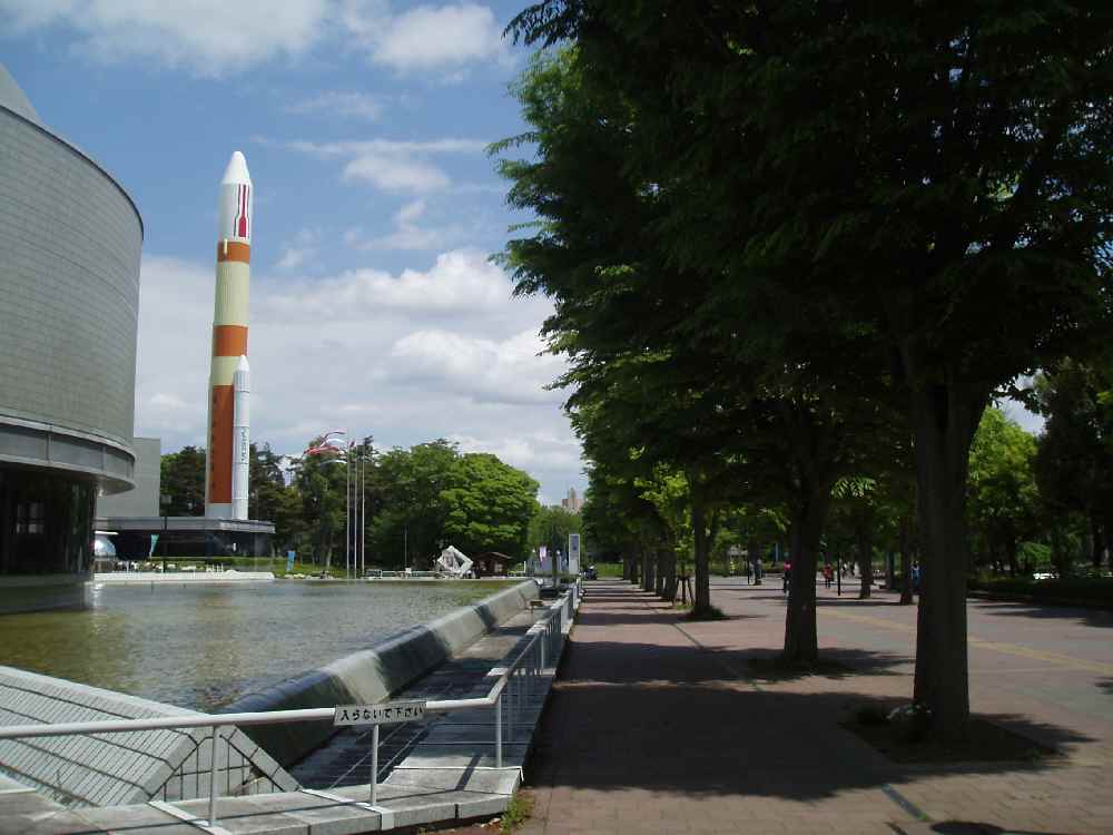 <写真2>大学からつくばセンターへ続く遊歩道兼自転車道。美しい街だ。あのロケットはハリボテを装って、実は中に核ミサイルが隠されているという伝説があった。 パーティー会場のオークラホテルに到着。懐かしい先輩・後輩とも再会。でも研究室OBでただ一人の同級生N氏が来れなかったのが残念。恩師・工藤教授にも近況を伺ってみると、退官後は実に優雅な生活を送られているようで羨ましい限り。2次会は同じセンタービルのレストランで、3次会は研究室に酒を持ち込んでの飲み会。在学中も研究室飲み会はちょくちょくやっており、ときには騒音公害並みの超バカ騒ぎをしたこともあったっけ。あの頃は若かった。
