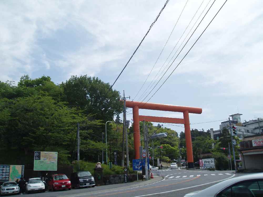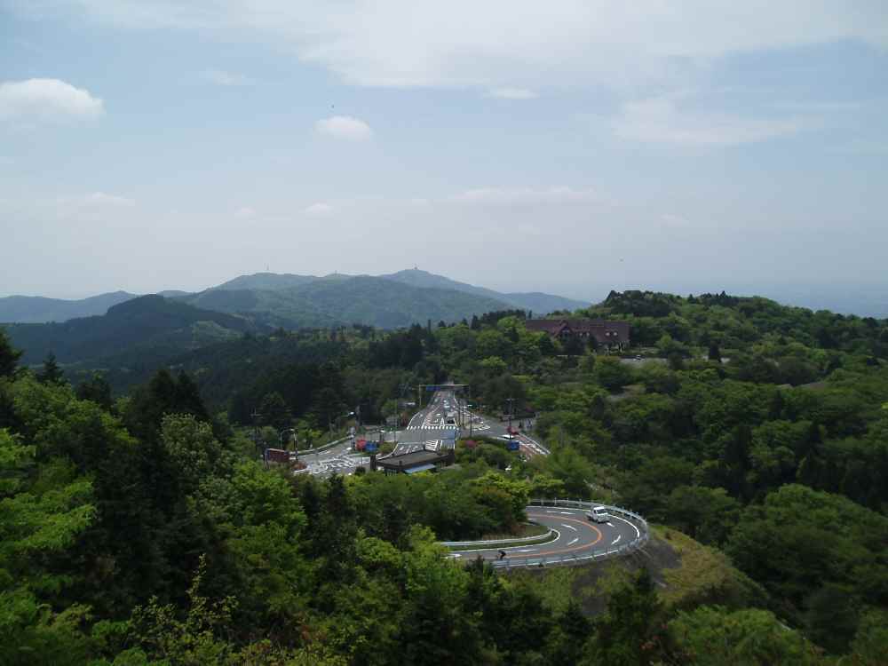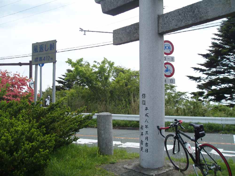 <写真4>頂上は800m以上あるが、車や自転車で行けるのは500m弱にあるロープウェー乗り場まで。 風返し峠、到着。とりあえず鳥居の前で休憩。と、更に上の道路からチャリが下ってきた。ここより上は以前は有料道路だったが、現在は一般道。ロープウェイ乗り場のある駐車場まで、ラスト1.6km。ググっと傾斜がきつくなる。道もうねって、さっき走ってた道がもう眼下に。先ほど峠を通過していったサイクリストの背中が見えてきたので追いかける。駐車場の入り口は料金所ゲートがあるため車が渋滞していた。対向車は来ないので中央線側から抜かしていって、到着。