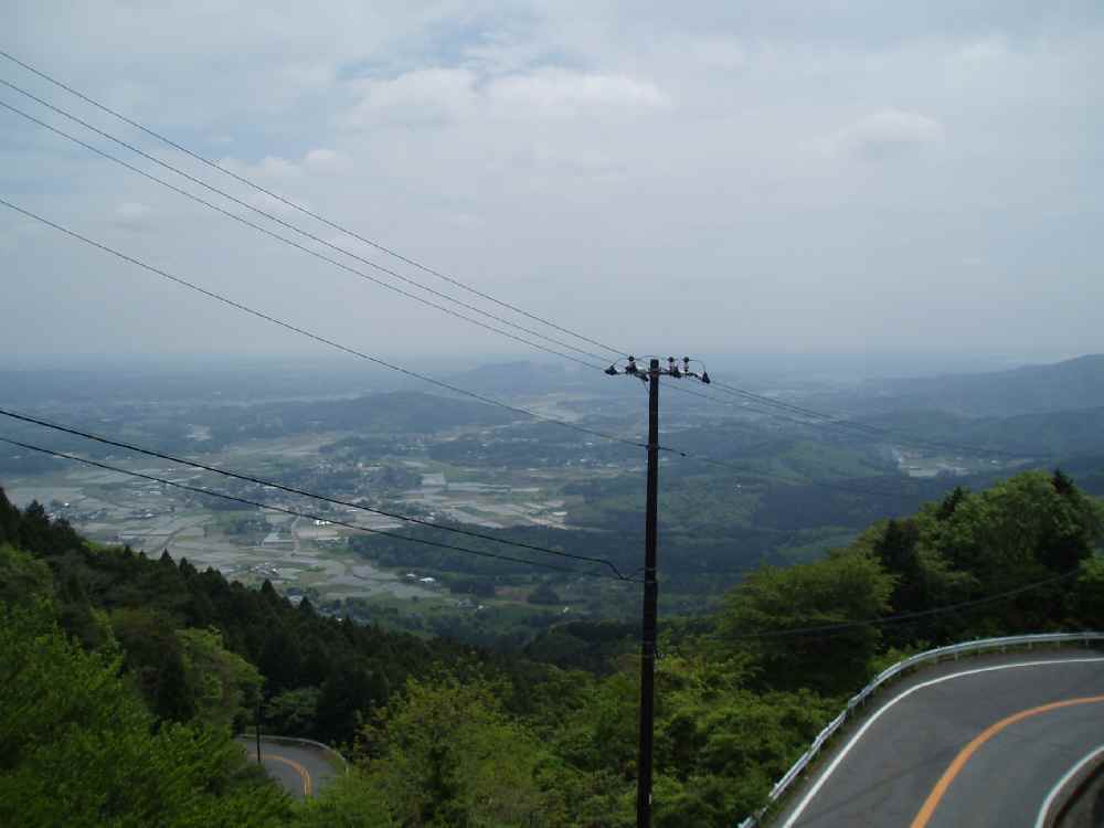 <写真6>下に見えている交差点が先ほどの風返し峠。 距離は麓から7km弱。標高500m弱だから、高低差で400m程度だろうか。距離は短いが、傾斜は予想よりキツかった。もっとラクに登っていけると思ってたのに・・・そんなに甘くはないか。ここから先は歩いて登るかロープウェイで頂上へ。今回はバイクシューズしかないので登山は割愛。朝飯軽かったのでコーラやソフトクリームでエネルギーをチャージ。 休憩してる間にも、ローディーが数名到着。風返し峠まで下る間にも更に数名とすれ違う。まぁこの近辺に住む坂バカにとっちゃ、練習に最適な場所だもんな。まさにドMのメッカ、筑波山(略して"DMMT")。 風返し峠から裏筑波・八郷方面へ下る。ノースリーブなので、下りは寒い。こちら側の道は例によってバイク(オートバイね)で攻めまくってる連中がいて危険。っていうかこいつら24時間ここにいるんちゃうか?下っていくと今度は集団で登ってくる自転車野郎ども。更には競輪選手だろうか、ピスト車の人も2人すれ違った。確かにギヤが一枚しかなかった。これってロードレーサーでアウター×トップで走り続けるのと同じってこと?それで山登るってこと??だとしたら、やはりプロは次元が違いますな。 ・・・ところで下りはどうするんだろう?ピスト車ってブレーキもついていないんじゃ?